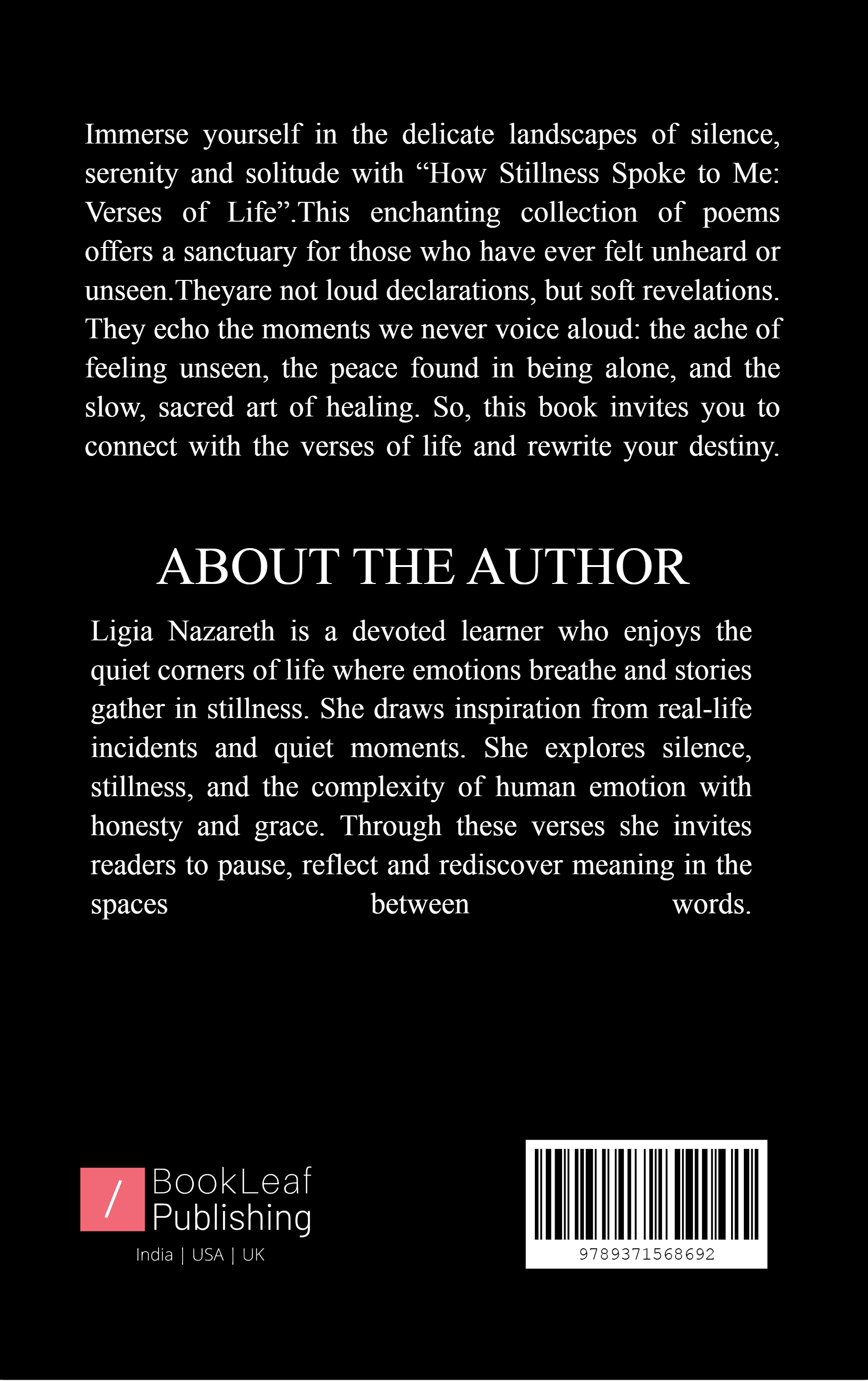 “How Stillness Spoke to Me: Verses of Life” offers a deeply personal collection of poems that emerge from life’s quietest moments. These introspective poems inspired by real experiences, trace emotional landscapes shaped by silence, solitude, hope, and healing. With minimalism and grace, the verses reflect on the power of stillness, the quiet strength in reflection, and the courage it takes to feel deeply in a noisy world. This book is a perfect choice for readers seeking words that resonate with self-reflection and is a soothing companion which echoes that even in silence, life speaks volumes.