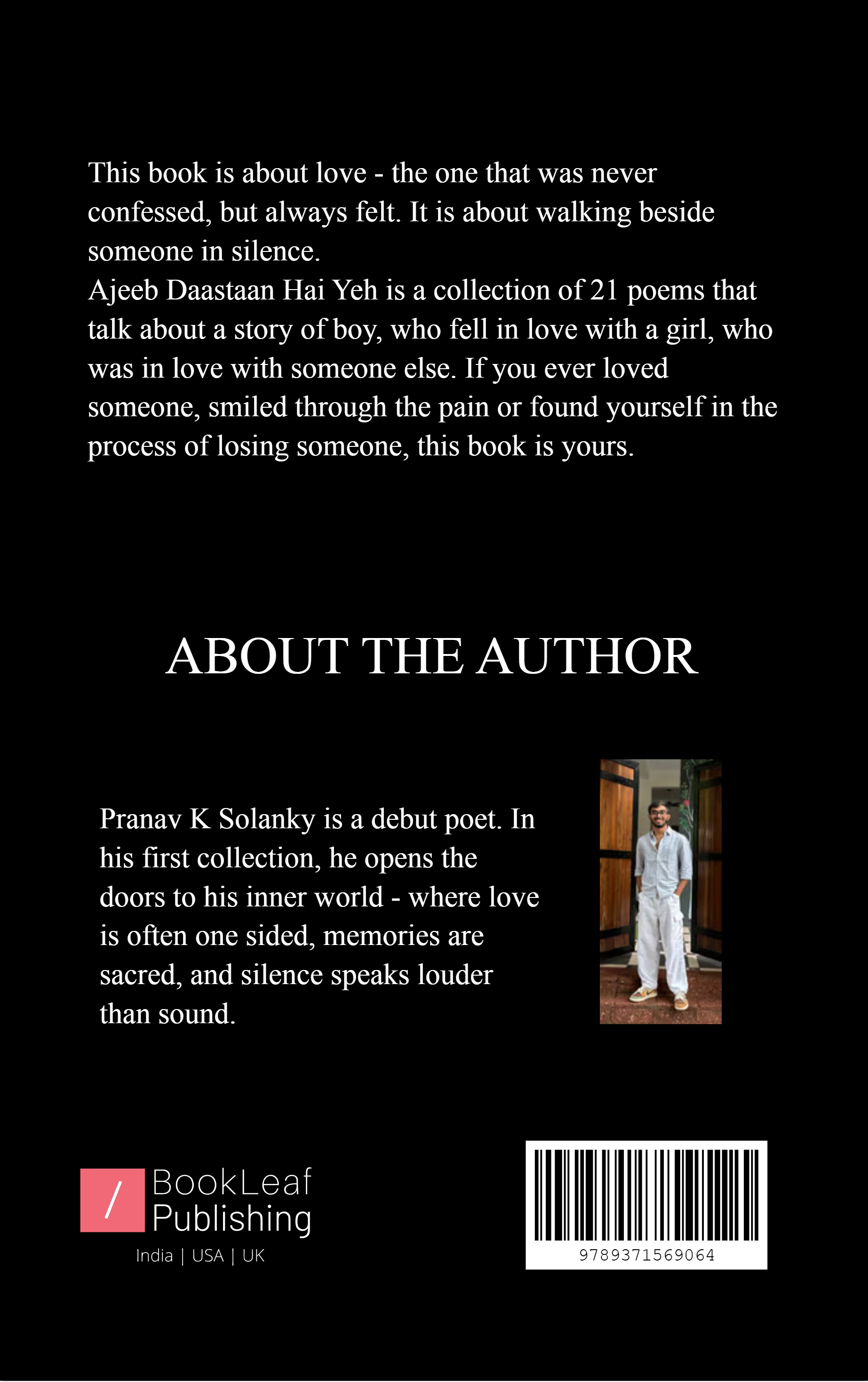 Ajeeb daastaan hai yeh is a collection of 21 poems that take readers on a journey through one-sided love, heartbreak, self discovery and acceptance. The poems are written in hindi and the context behind them is explained in english, this book speaks to anyone who has loved silently and felt deeply.