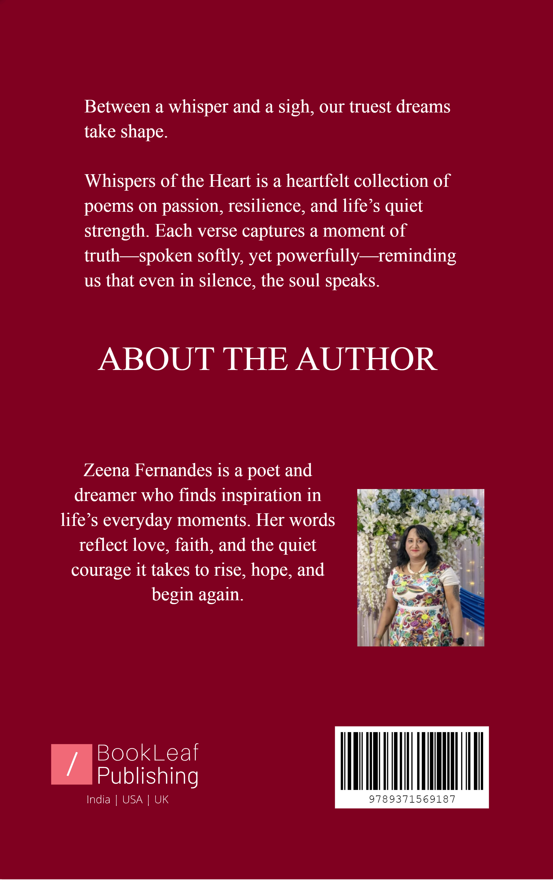 Whispers of the Heart is a heartfelt collection of 22 poems that echo life’s quiet strength, deep emotions, and the power of dreams. Through themes of love, family, passion, and perseverance, Zeena Fernandes brings to life stories that inspire and heal. Each poem reflects a part of her journey — filled with faith, resilience, and hope — offering comfort to anyone walking their own path. Gentle, soulful, and uplifting, this book reminds us that even in silence, the heart always speaks.