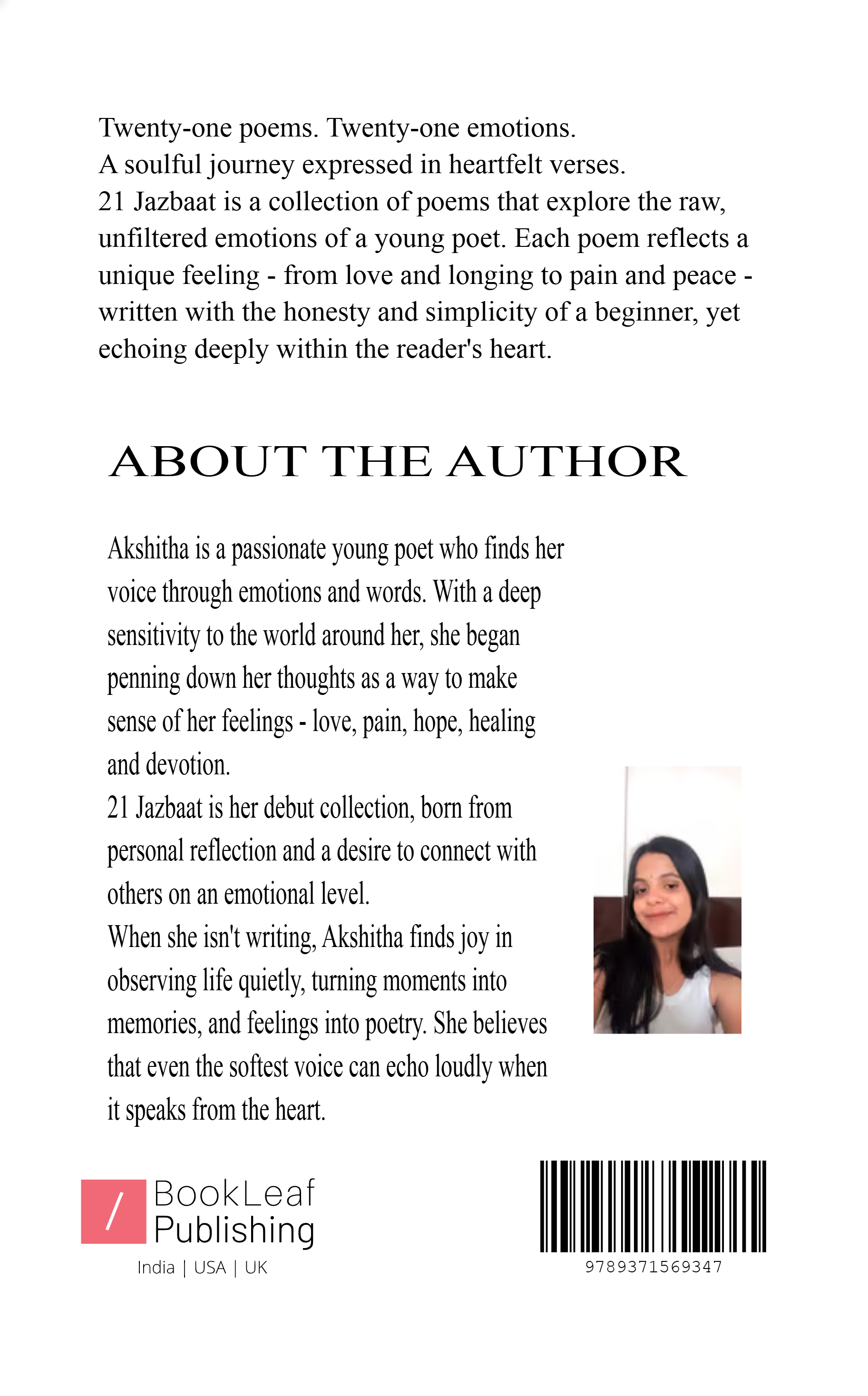 21 Jazbaat is a heartfelt collection of 21 poems, each reflecting a unique emotion from the depths of a young poetess's soul. From love and longing to loss and liberation, every piece carries a piece of her journey - raw, real and unfiltered. These are not just poems; they are whispers of unsaid feelings, battles, and small victories that shape the heart.