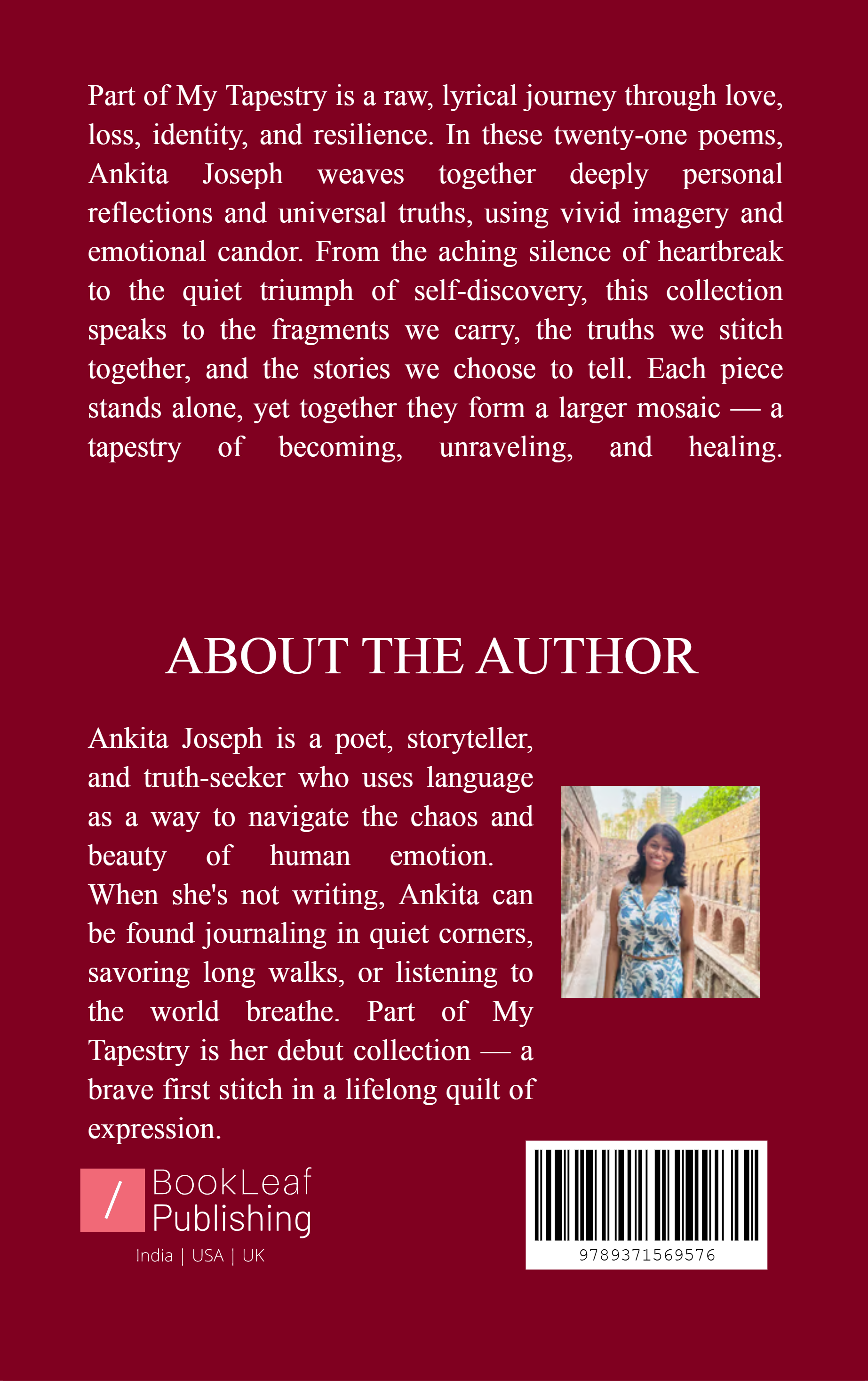 Part of My Tapestry is a deeply personal poetry collection that threads together universal themes of love, loss, self-image, healing, and resilience. With an intimate voice and reflective tone, Ankita Joseph invites readers into the quiet and complex corners of her inner world. These poems explore what it means to feel deeply, to grow through pain, and to reclaim one's sense of self — one stitch at a time.