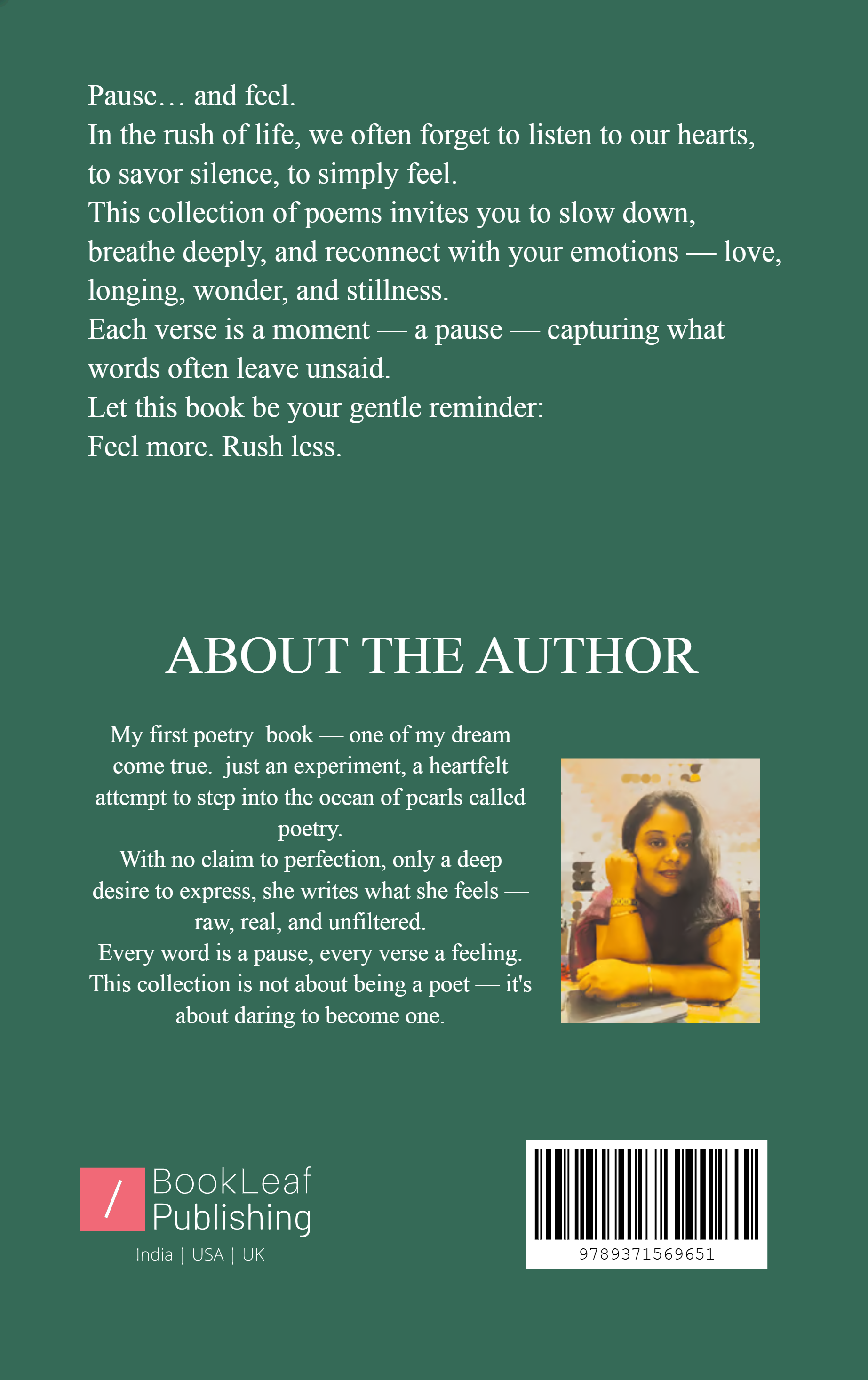 Pause and Feel सिर्फ कविताओं का संग्रह नहीं, बल्कि एक अंतरयात्रा है। यह किताब आपको एक पल ठहरने, साँस लेने और उन भावनाओं से जुड़ने का निमंत्रण देती है जिन्हें हम अक्सर अनदेखा कर देते हैं। प्रेम की कोमल फुहारों से लेकर अकेलेपन की खामोशियों तक, हर कविता दिल की गहराई से निकली है। ये पंक्तियाँ शोर नहीं मचातीं, बल्कि धीरे से मन को छू जाती हैं। अगर आप सुकून, अपनापन या बस खुद से मिलने की तलाश में हैं, तो यह किताब एक शांत दोस्त की तरह आपके साथ बैठ जाएगी—और कहेगी, "रुको ज़रा... महसूस तो करो।"