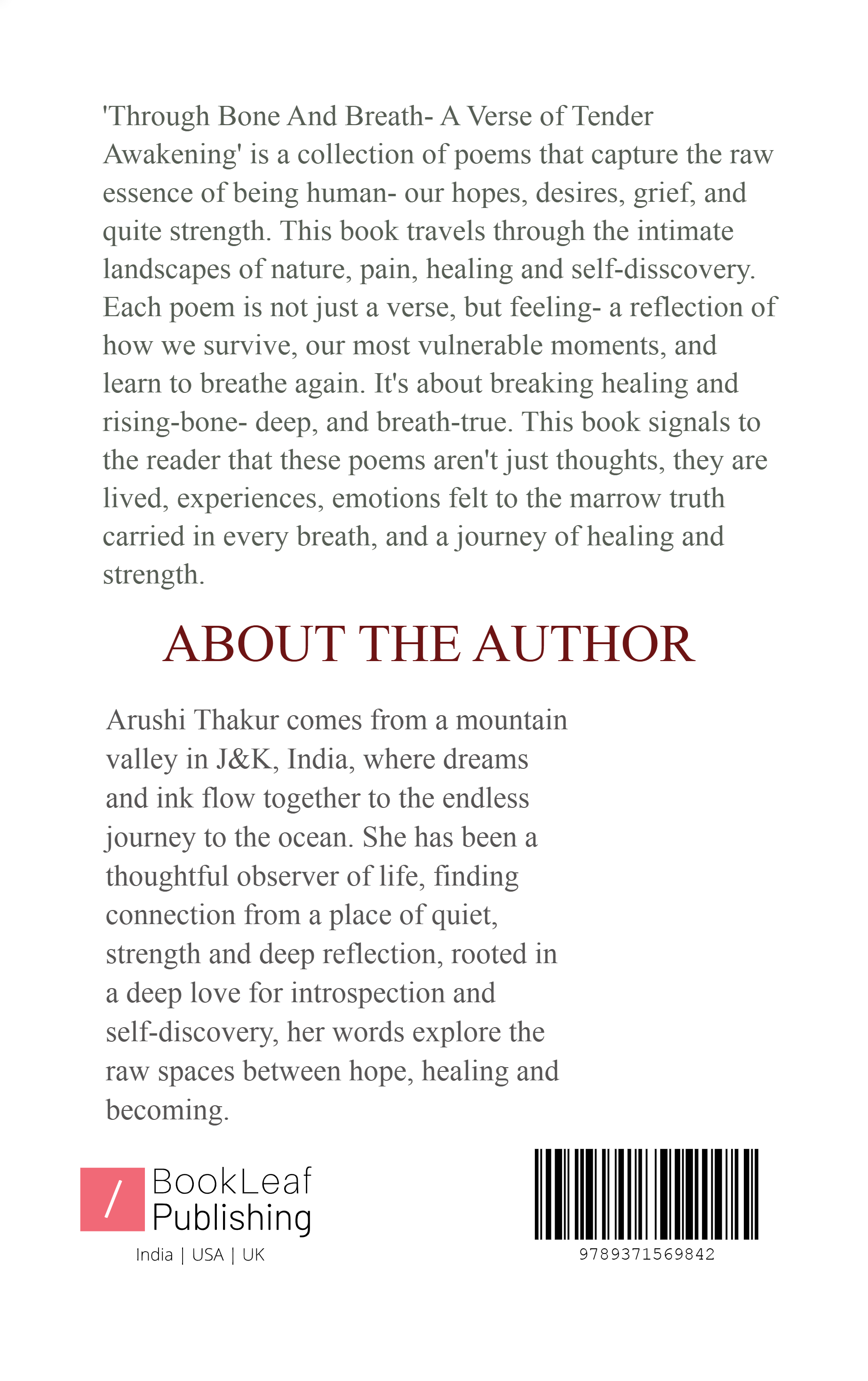 “Through Bone And Breath- A Verse of Tender Awakening” is a lyrical exploration of resilience, memory, and the quiet strength of the human spirit. Woven through with raw vulnerability and poetic precision, this book traces the journey of a soul as it navigates love, loss, and transformation. Each page pulses with emotion—grief held in the marrow, hope whispered in every exhale. It is a meditation on what it means to endure, to be broken and still breathe, to carry both ache and awe in the same body. Through Bone and Breath invites readers to find beauty in becoming—and solace in knowing they are not alone.