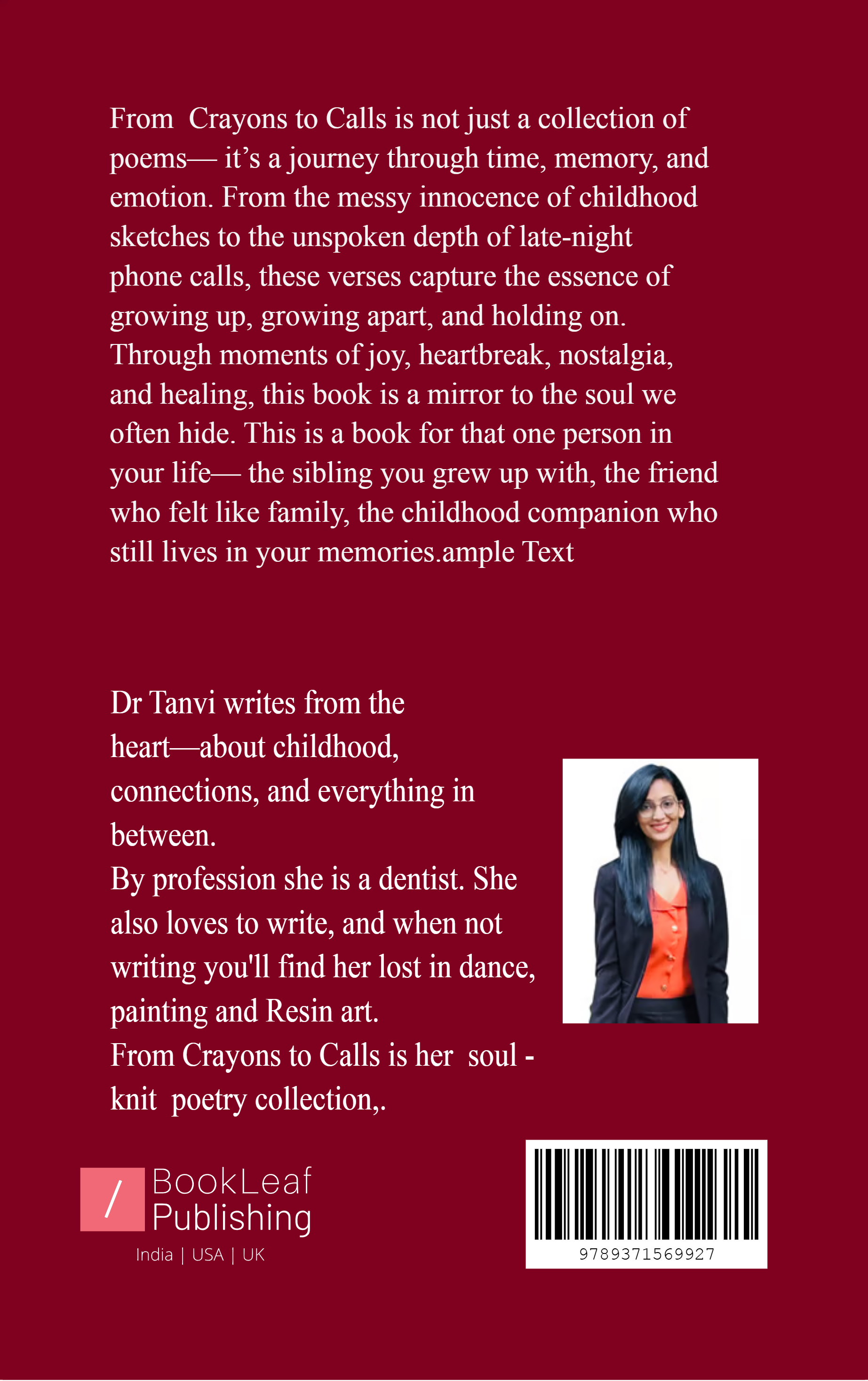 From Crayons to Calls is not just a collection of poems— it’s a journey through time, memory, and emotion. From the messy innocence of childhood sketches to the unspoken depth of late-night phone calls, these verses capture the essence of growing up, growing apart, and holding on. Through moments of joy, heartbreak, nostalgia, and healing, this book is a mirror to the soul we often hide. This is a book for that one person in your life— the sibling you grew up with, the friend who felt like family, the childhood companion who still lives in your memories.