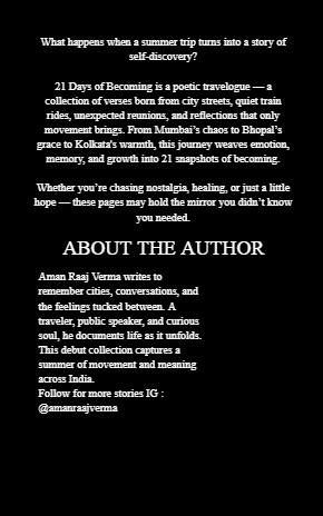 21 Days of Becoming is a poetic travelogue tracing a soul-stirring summer journey across Indian cities. Through 21 evocative poems, Aman Raaj Verma captures the essence of movement, memory, and personal growth from bustling streets to quiet train rides, old friendships to unexpected reflections. Each day reveals a new layer of self, as the writer navigates not just landscapes, but emotions and transformation. Blending nostalgia, discovery, and intimacy, this debut collection invites readers to pause, feel, and reflect on their own becoming. A heartfelt companion for anyone in love with life’s in-betweens.