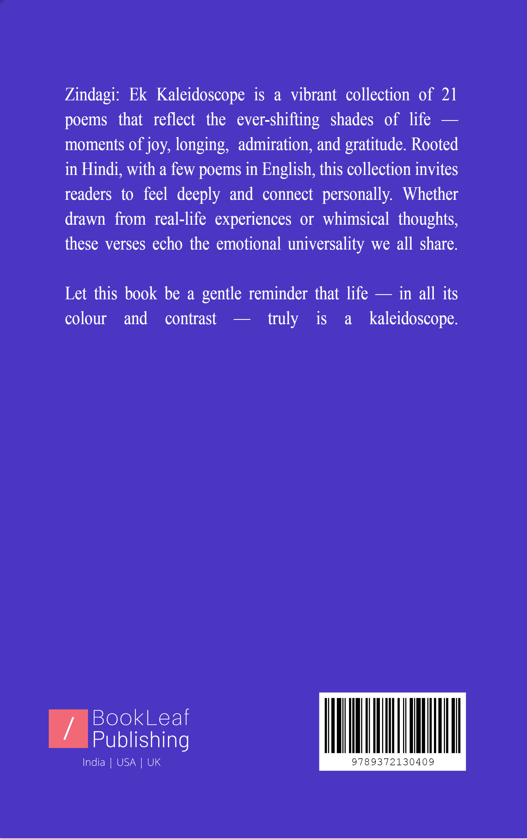 Zindagi Ek Kaleidoscope is a heartfelt collection of 21 poems that reflect the many shades of life—its emotions, stories, and whimsical moments. Mostly written in Hindi, with a few in English, these poems capture universal feelings through personal experiences. From tributes and reflections to playful verses and quiet observations, each piece invites the reader to connect with their own memories and emotions. Zindagi Ek Kaleidoscope reminds us that life, with all its colors and patterns, is poetry waiting to be seen.