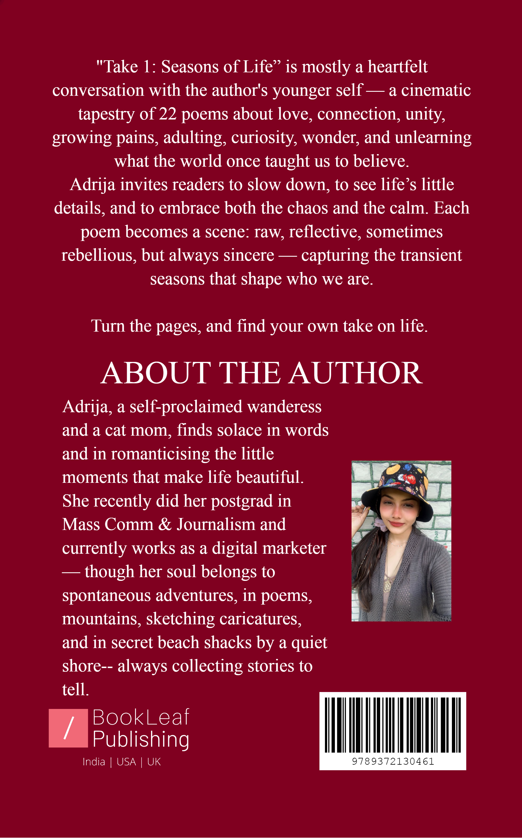 Adrija invites readers to slow down, to see life’s little details, and to embrace both the chaos and the calm. Each poem becomes a scene: raw, reflective, sometimes rebellious, always sincere — capturing the fleeting seasons that shape who we are.