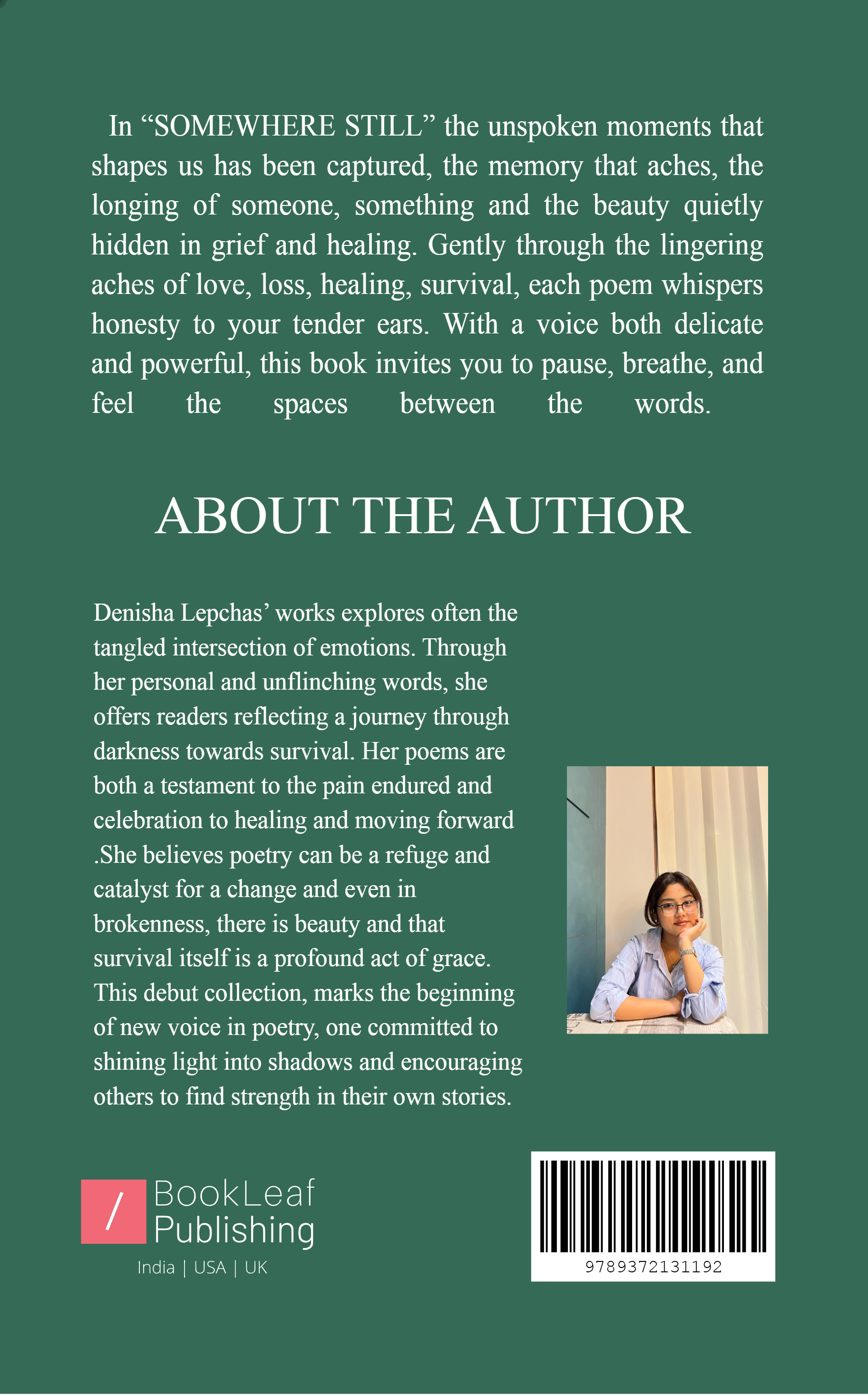 “SOMEWHERE STILL” a collection of poems, dives us deep into the transverse of the difficult terrain of emotions, moments of vulnerability and resilience. Every word written speaks about the silent struggles carried, scars left behind and delicate yet painful journey towards healing. Holding on to some courage this collection invites readers to embrace their stories and find solace in it. For ‘even the broken parts are worthy of light somewhere’.