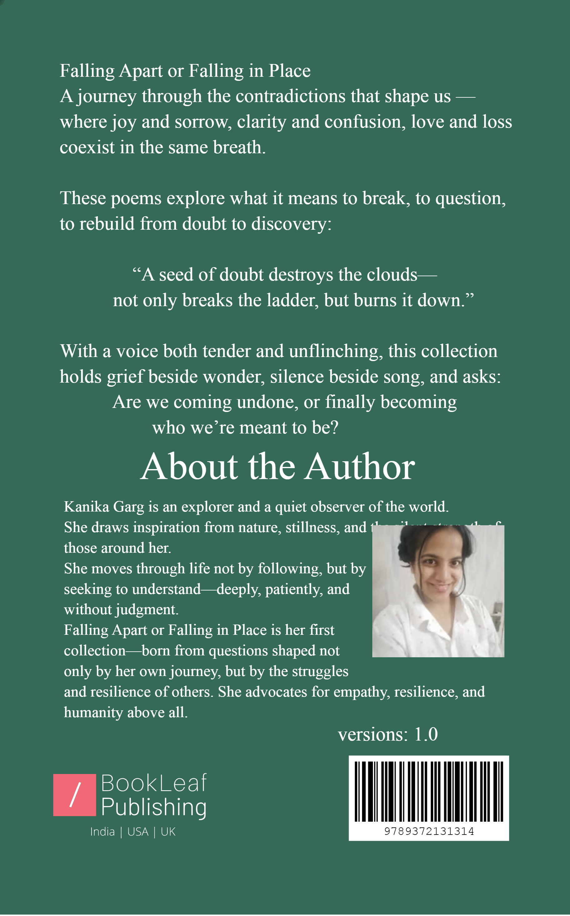 Falling Apart or Falling in Place is a deeply introspective poetry collection that explores the space between breaking and becoming. With tenderness and clarity, these poems reflect on grief, healing, identity, and the quiet strength that rises through struggle. Through vivid imagery and emotional honesty, the collection invites readers to sit with discomfort, rediscover inner light, and find meaning in uncertainty. Whether you're moving through loss, rebuilding, or simply learning to pause, these poems remind you: falling apart isn’t failure—it may be the first step toward falling into place.