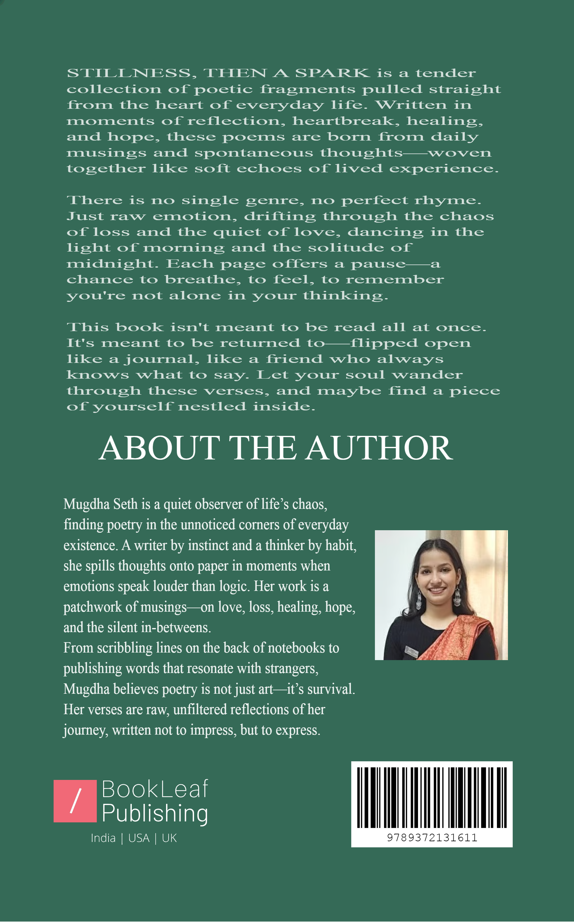 STILLNESS, THEN A SPARK is a tender collection of poetic fragments pulled straight from the heart of everyday life. Written in moments of reflection, heartbreak, healing, and hope, these poems are born from daily musings and spontaneous thoughts—woven together like soft echoes of lived experience.