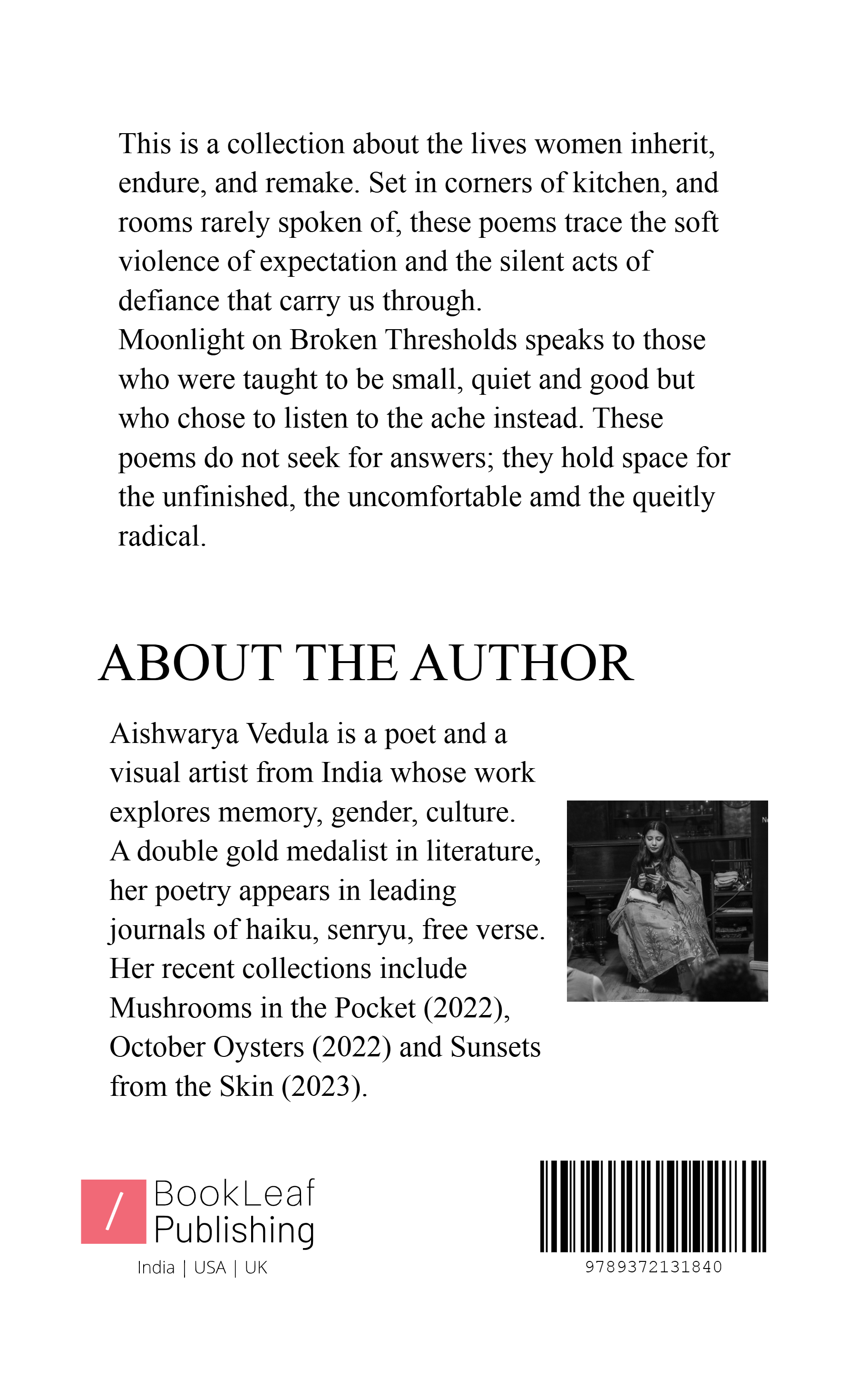 In this honest and powerful collection, Aishwarya explores the quiet struggles and quiet strengths of womanhood. Her poems move through kitchens heavy with tradition, bedrooms filled with memories, and family homes where love and duty blur.