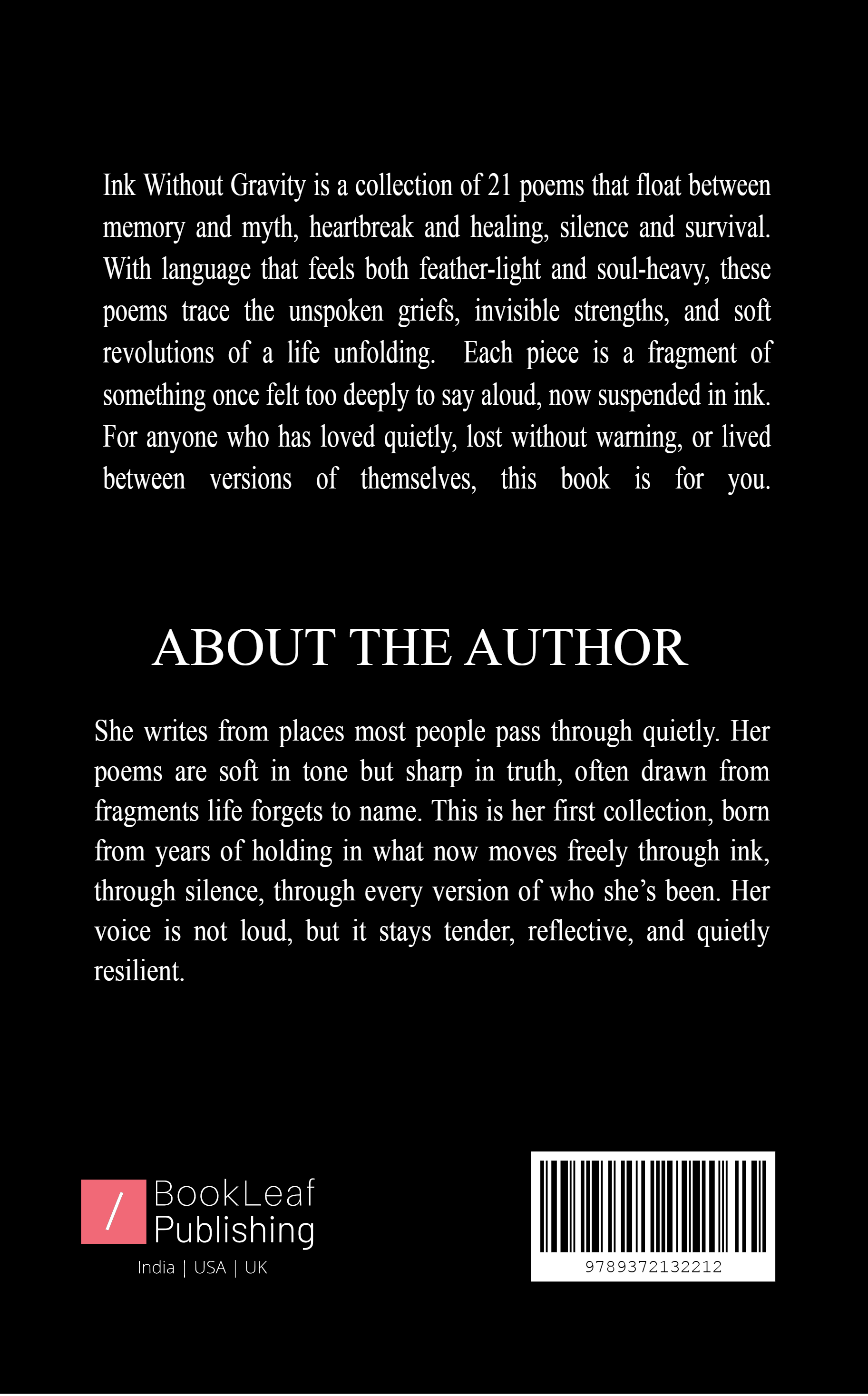 Ink Without Gravity is a poetic journey through memory, healing, heartbreak, and quiet survival. Each poem floats between the deeply personal and the universally felt, capturing emotions we often struggle to name. This debut collection is for readers who love introspective poetry, lyrical language, and themes of resilience, identity, and transformation. With raw vulnerability and surreal beauty, these 21 poems invite you to pause, feel, and find pieces of yourself. A must-read for fans of Rupi Kaur, Yrsa Daley-Ward, and anyone navigating the space between what was and what still lingers.