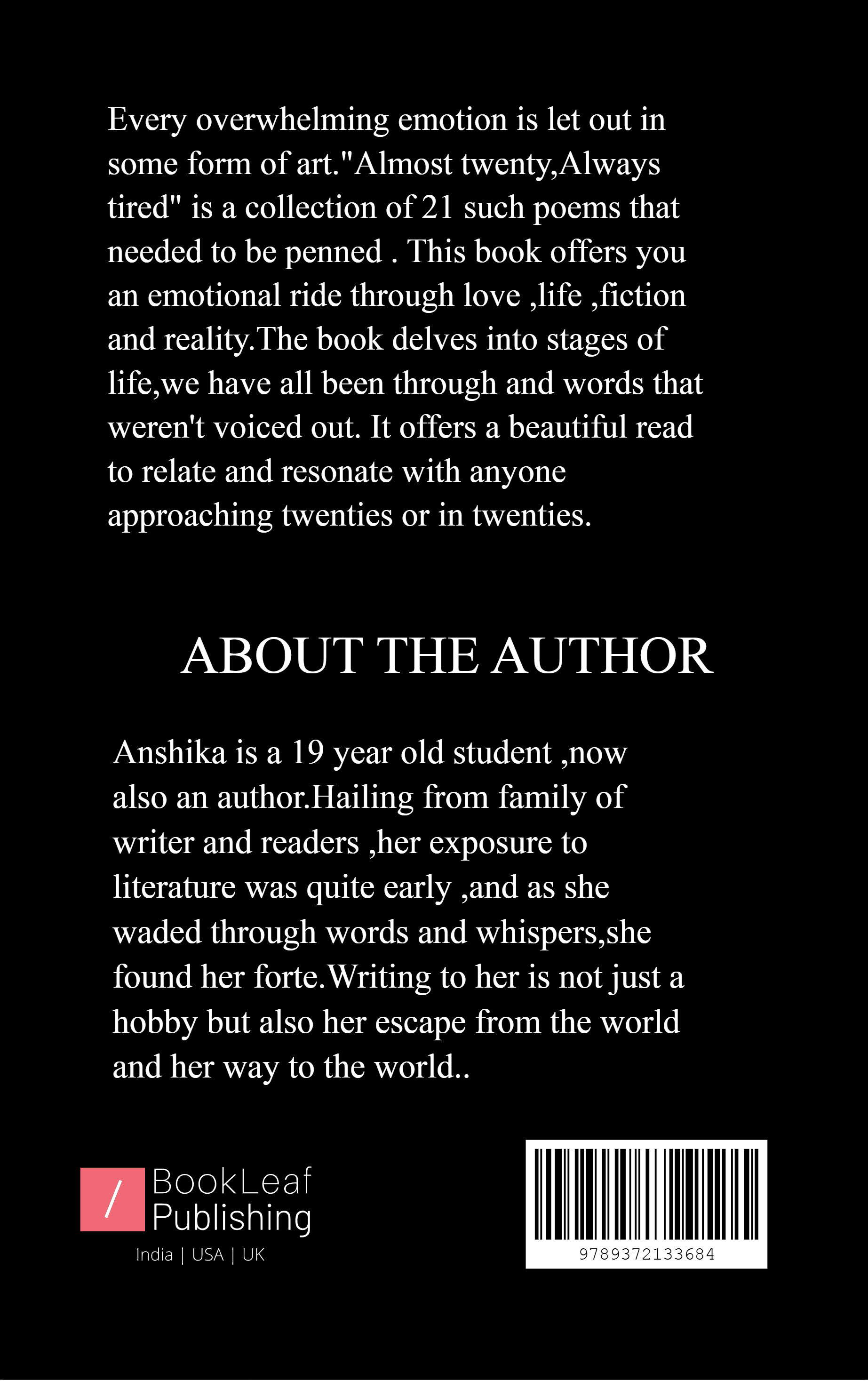 Every overwhelming emotion is let out in some form of art."Almost twenty,Always tired" is collection of 21 such poems that needed to be penned . This book offers you an emotional ride through love ,life ,fiction and reality.The book delves into stages of life,we have all been through and words that weren't voiced out. It offers a beautiful read to relate and resonate with anyone approaching twenties or in twenties.