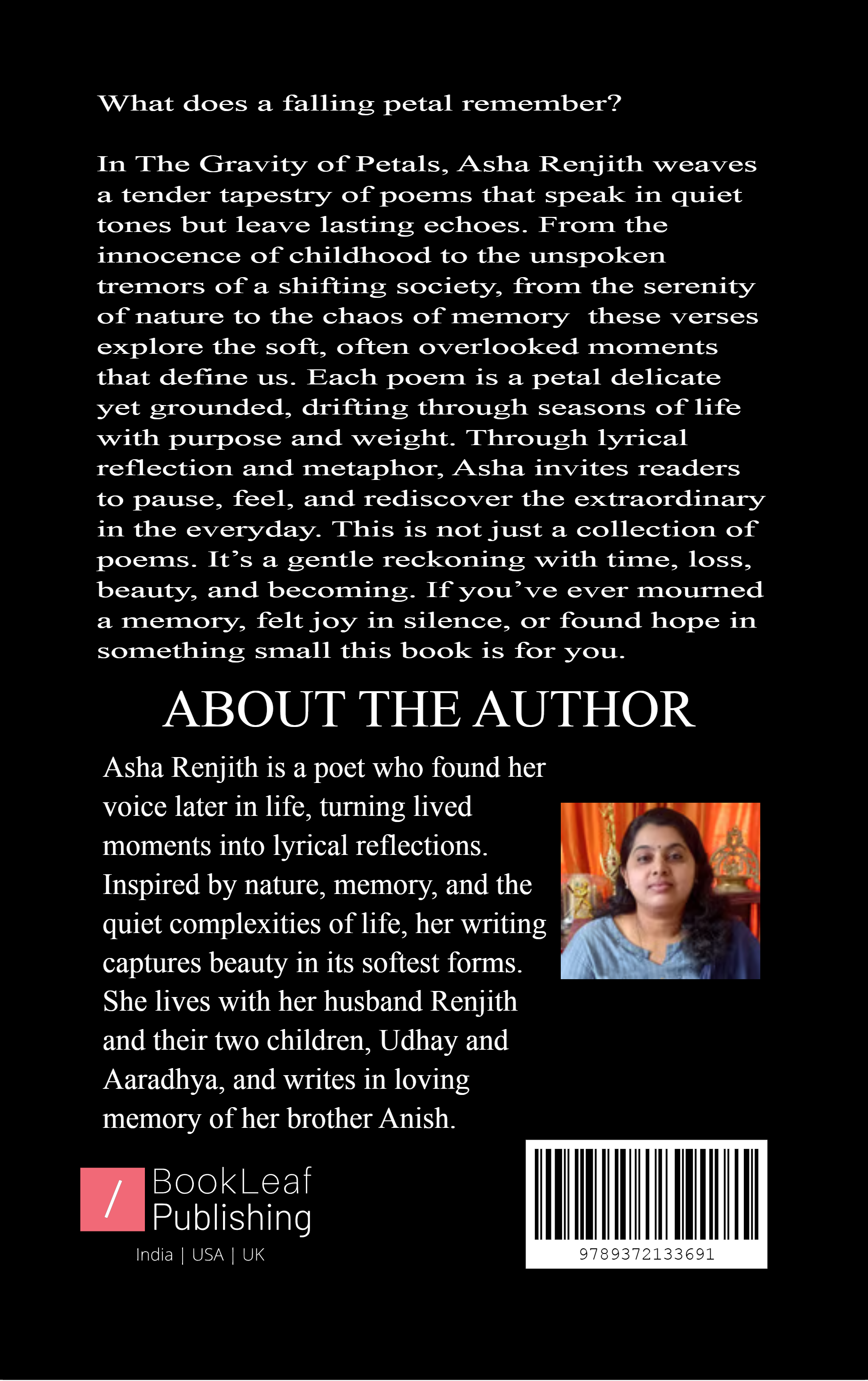 The Gravity of Petals is a soulful collection of contemporary poems exploring the delicate weight of life’s quietest moments. Asha Renjith captures the essence of childhood, the rhythms of nature, and the subtle shifts of society through lyrical, introspective verse. Each poem is a petal; fragile yet purposeful, falling with meaning and memory. Written with emotional honesty and poetic grace, this debut collection invites readers to pause, reflect, and find beauty in the fleeting. For those who listen to life’s softer echoes, these poems will linger long after the last page.