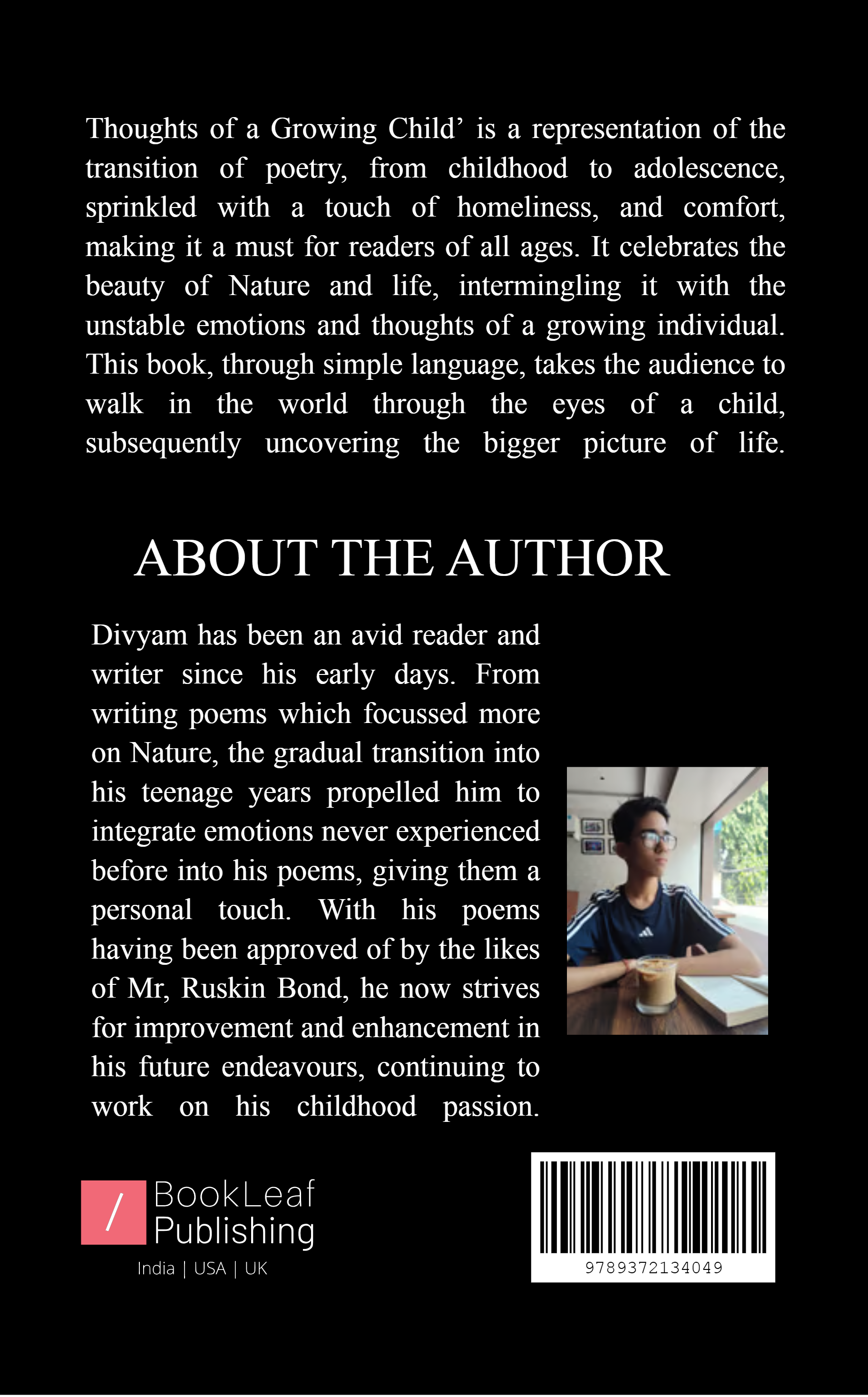 ‘Thoughts of a Growing Child’ is a representation of the transition of poetry, from childhood to adolescence, sprinkled with a touch of homeliness, and comfort, making it a must for readers of all ages. It celebrates the beauty of Nature and life, intermingling it with the unstable emotions and thoughts of a growing individual. This book, through simple language, takes the audience to walk in the world through the eyes of a child, subsequently uncovering the bigger picture of life.