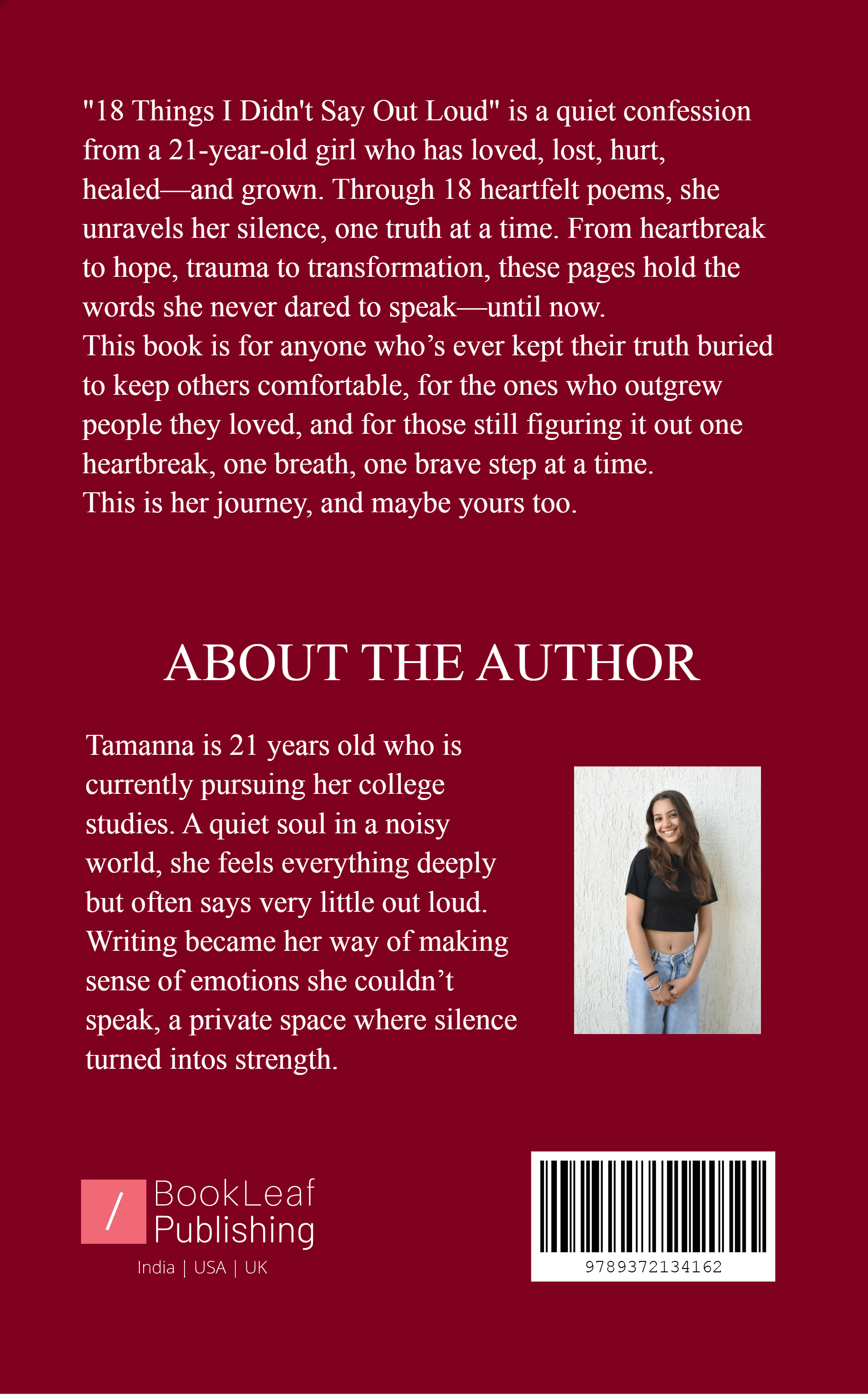 18 Things I Didn’t Say Out Loud is a tender, honest collection of poems from a 21-year-old who’s felt too much and said too little until now. These pages explore heartbreak, healing, friendships lost and found, family complexities, silent battles, and the bittersweet lessons life throws at us. It’s a quiet confession for anyone who’s ever bottled things up to keep the peace. It’s raw, relatable, and just emotional enough to make you cry and maybe laugh when you realise you’ve been there too.