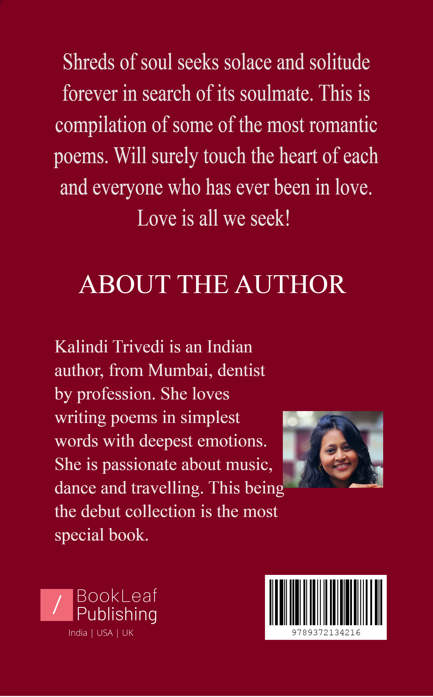 Shreds of soul, seeks solace and solitude, forever in search of its soulmate. This book is compilation of some of the most romantic poems. The feeling of love needs no words. Be in love to feel the love! Lets make room for love!