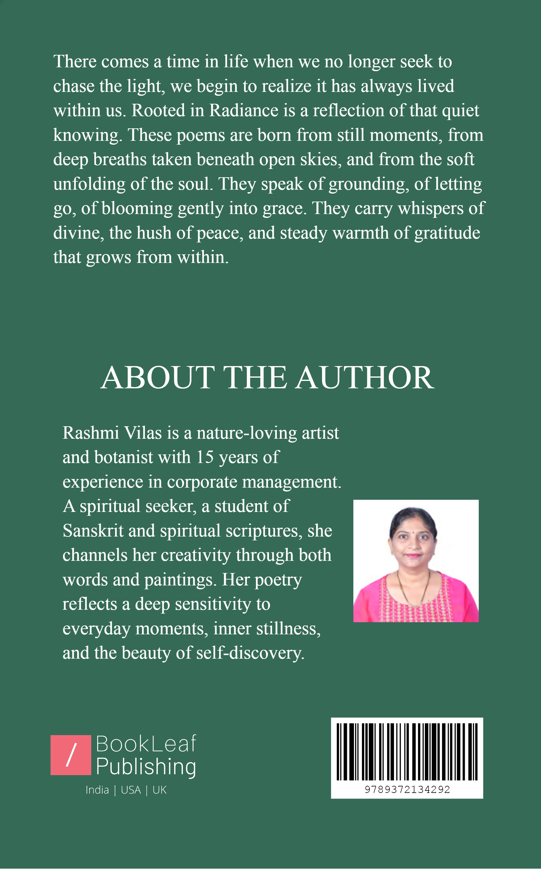 Rooted in Radiance is a reflection of that quiet knowing. These poems are born from still moments, from deep breaths taken beneath open skies, and from the soft unfolding of the soul. They speak of grounding, of letting go, of blooming gently into grace. They carry whispers of divine, the hush of peace, and steady warmth of gratitude that grows from within.