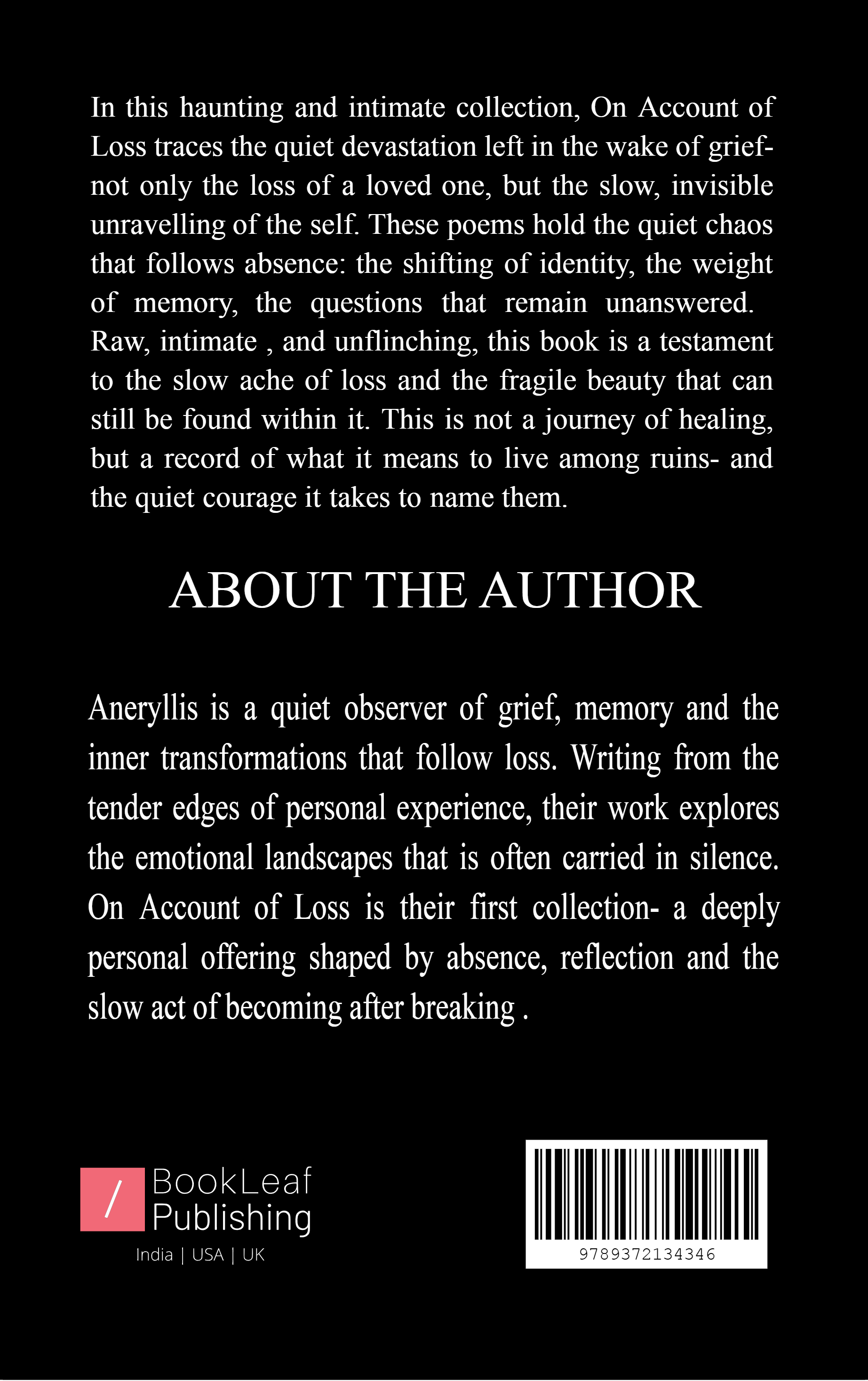 On Account of Loss is a collection of poems that speaks to what remains after grief. More than the loss of a loved one, it explores the quiet unraveling of the self—the parts that vanish in absence, the questions that remain unspoken.