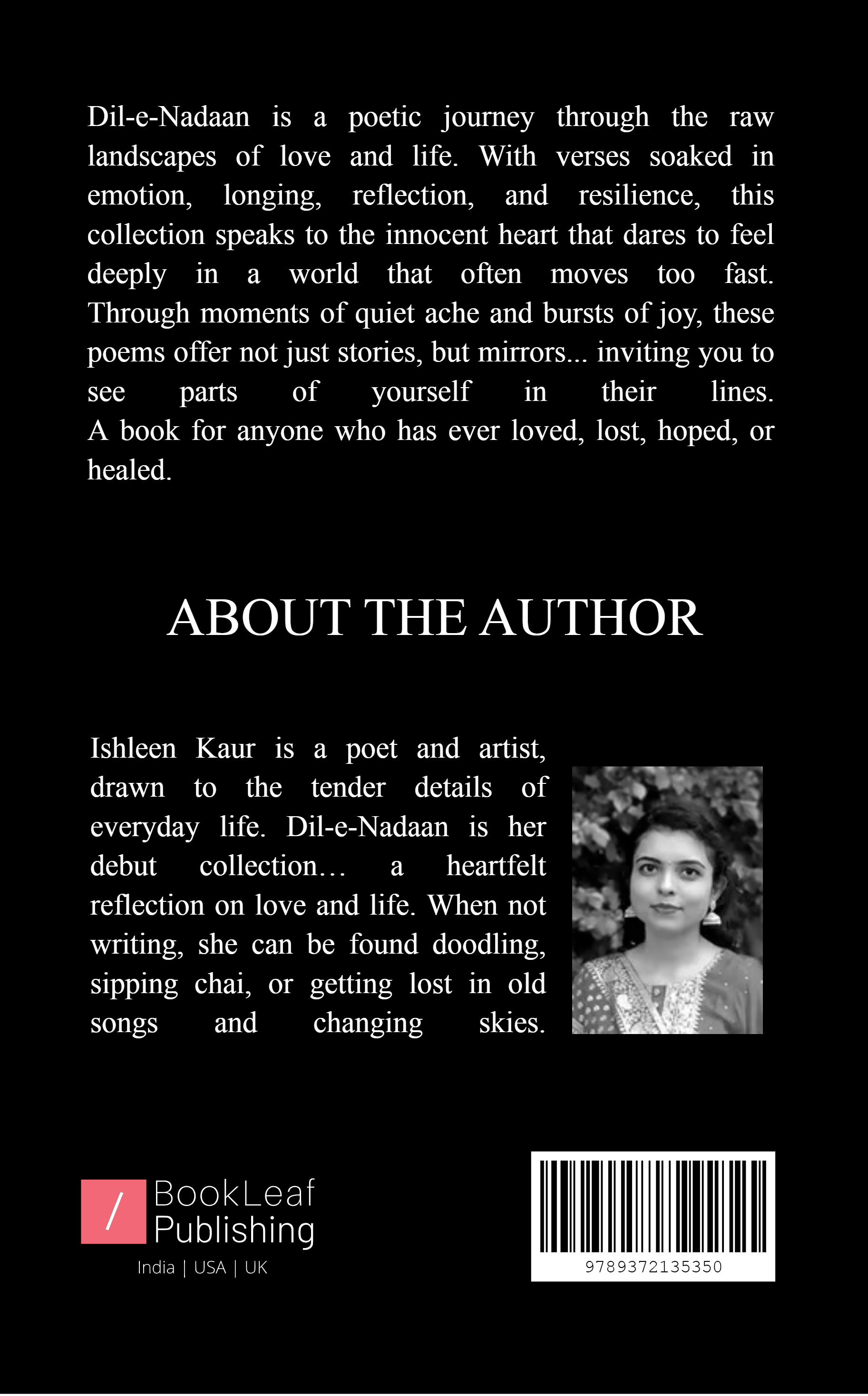 Dil-e-Nadaan is a heartfelt collection of poems exploring the fragile beauty of human emotions… love in its most tender and painful forms, and life in all its unpredictability. Written with honesty and depth, each poem captures the inner conversations we have with ourselves and those we hold close, in presence or in memory.