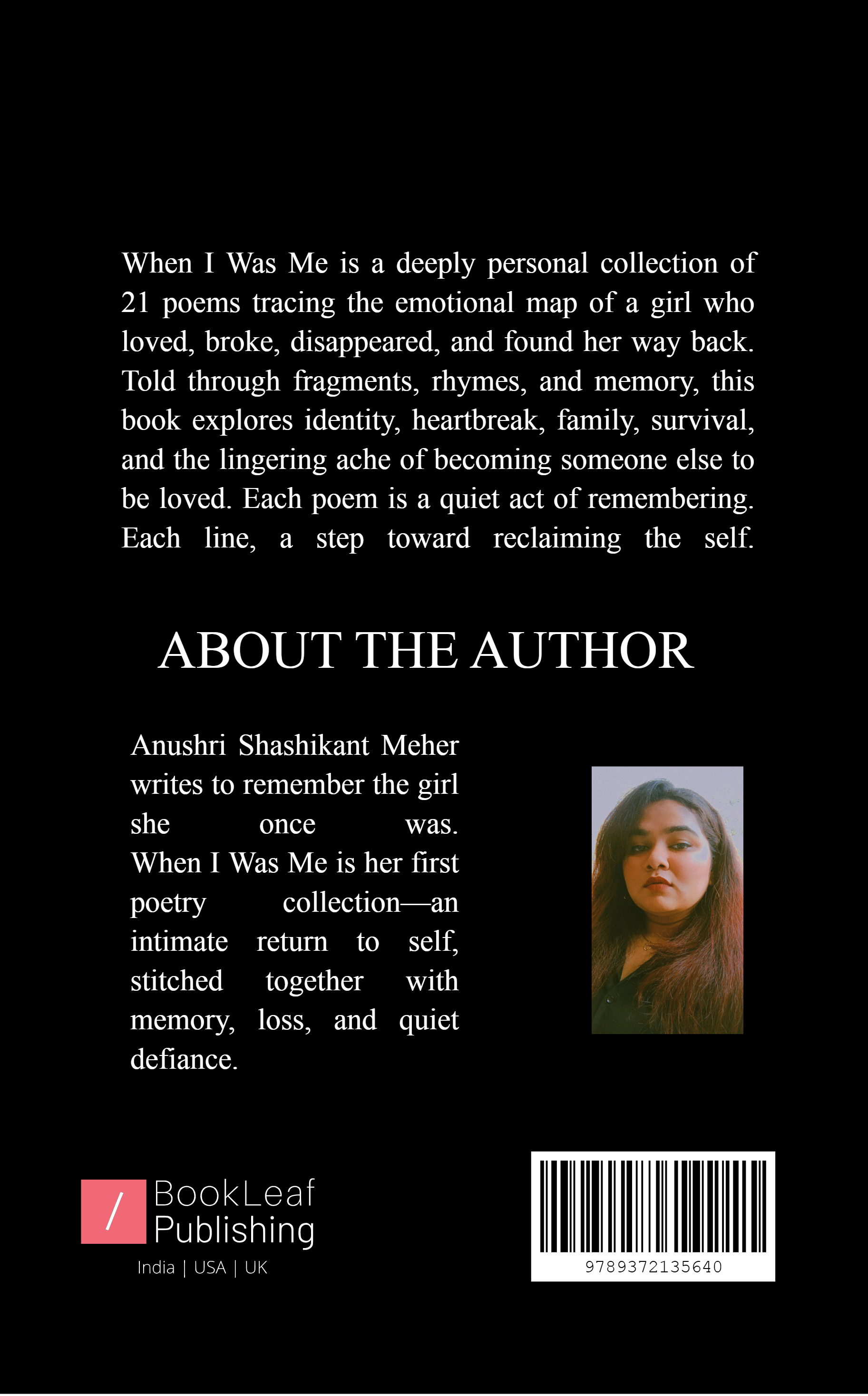 When I Was Me is a deeply personal collection of 21 poems tracing the emotional map of a girl who loved, broke, disappeared, and found her way back. Told through fragments, rhymes, and memory, this book explores identity, heartbreak, family, survival, and the lingering ache of becoming someone else to be loved. Each poem is a quiet act of remembering. Each line, a step toward reclaiming the self.