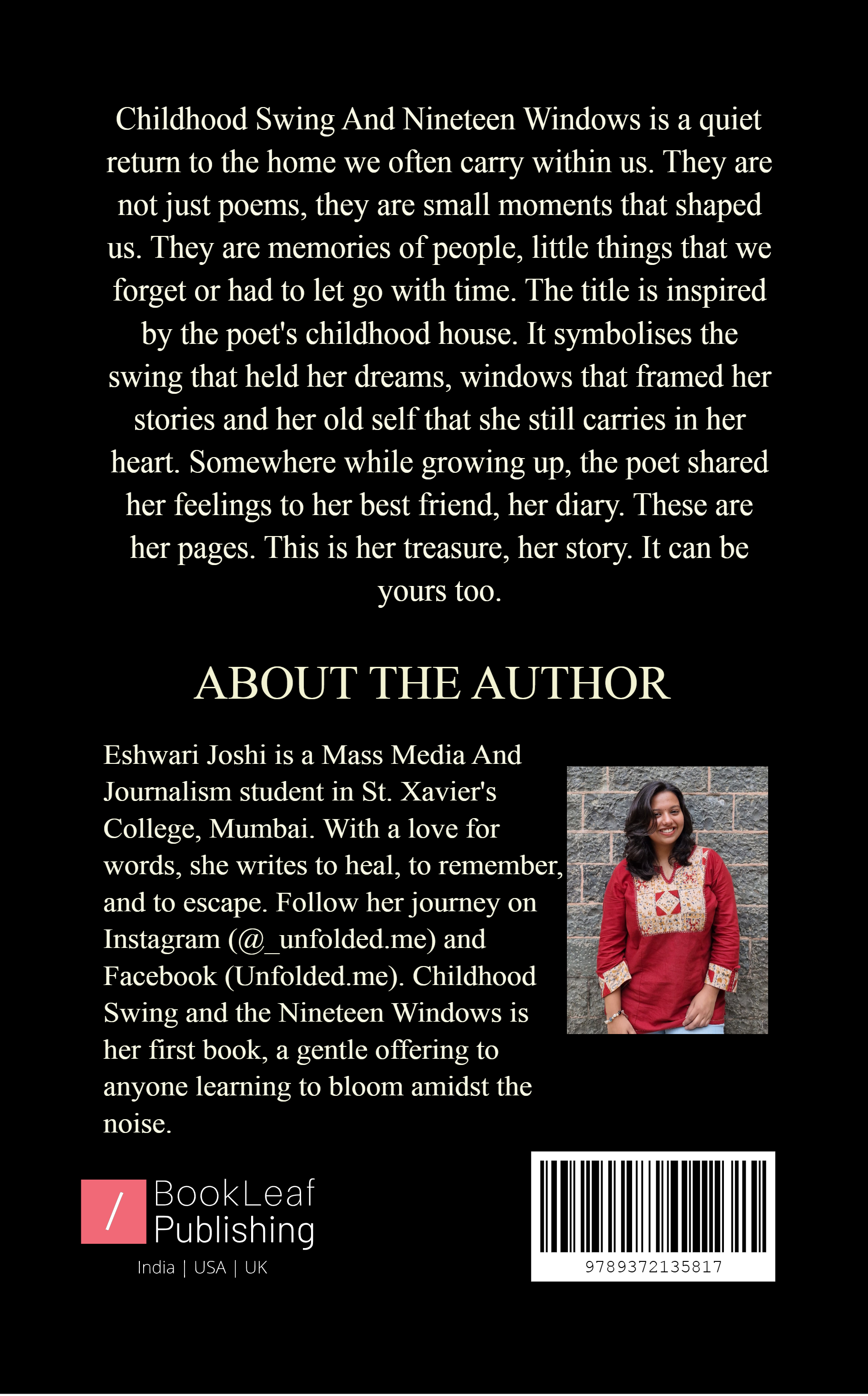 Childhood Swing And The Nineteen Windows is a tender collection of poems that traces the journey of growing up as a girl in a world full of noise, wonder, chaos, and change. Through vivid imagery and heartfelt verses, the innocence of childhood, the resilience of young women, and the quiet strength it takes to keep smiling through life’s unpredictability is shown. The title is inspired by the poet's childhood house. It is about the swing that swayed and the windows that stayed. This book is like a hug for every girl learning to honour her roots while growing into her power.