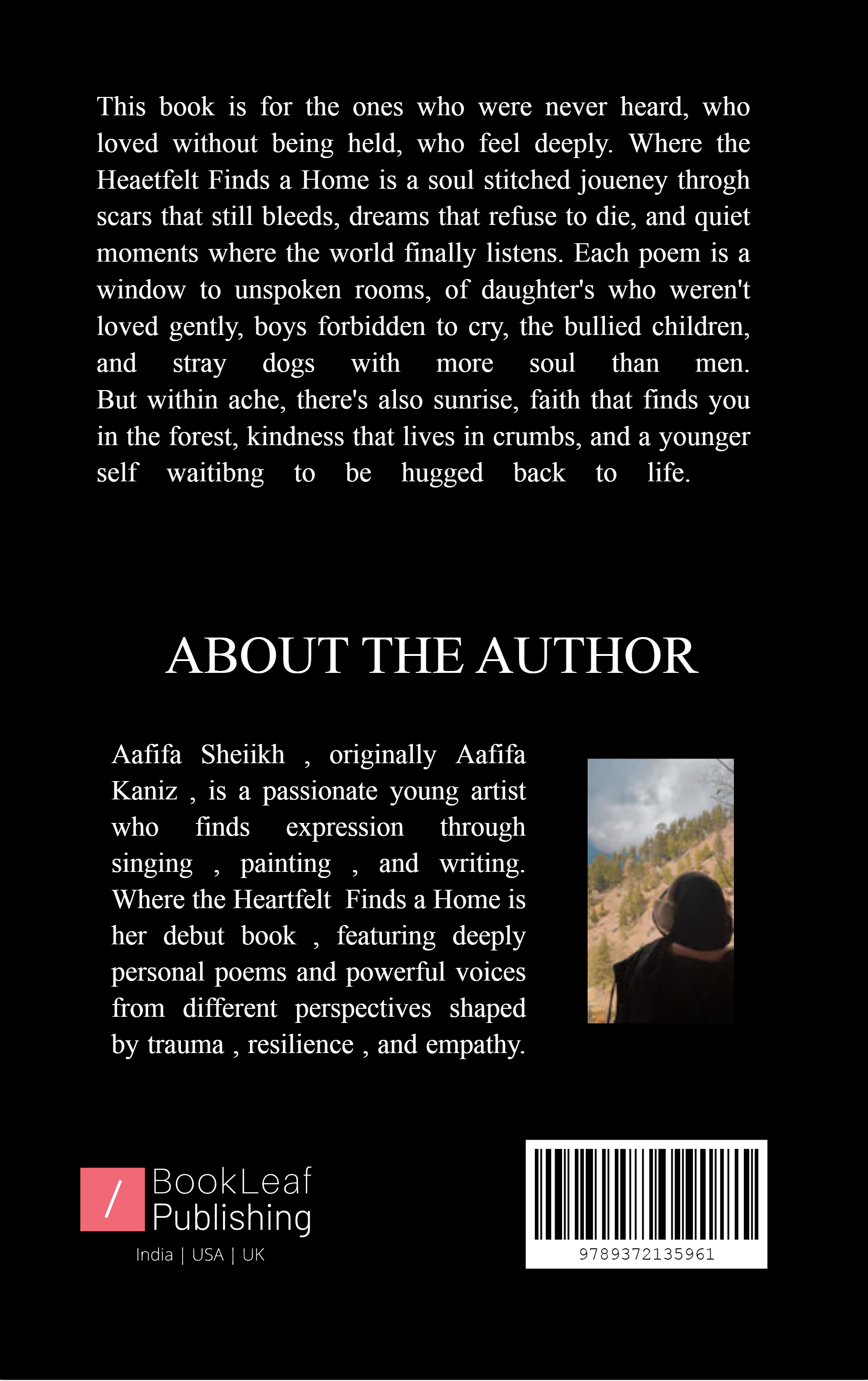 Where the Heartfelt Finds a Home is a soul-stirring collection of poems that explores the raw edges of emotion—grief, love, silence, healing, and everything in between. Aafifa Sheiikh writes with a voice both intimate and universal, drawing from her own journey as well as imagined perspectives of pain, growth, and resilience. Each poem invites you to pause, to feel deeply, and to remember that even in our most fragile moments, the heart always finds its way home.