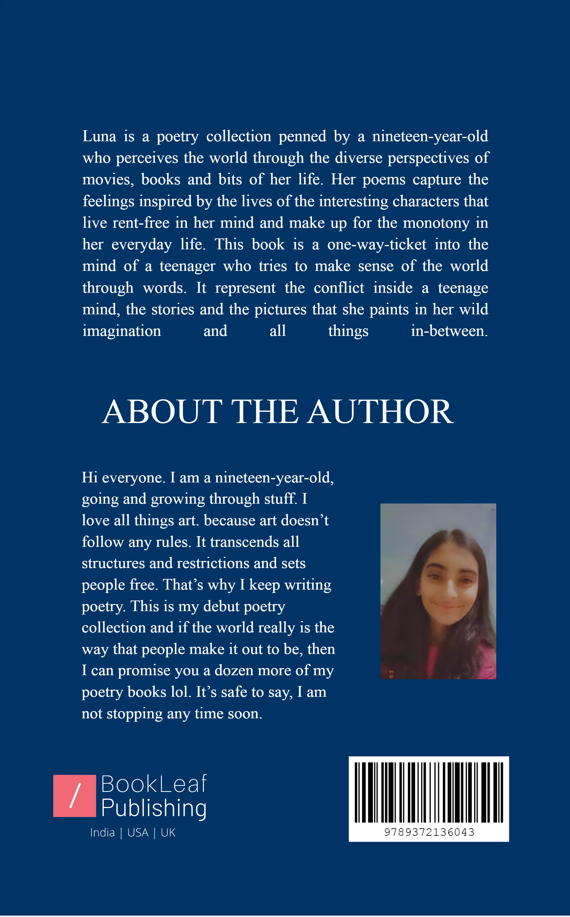 Luna is a poetry collection penned by a nineteen-year-old who perceives the world through the diverse perspectives of movies, books and bits of her life. Her poems capture the feelings inspired by the lives of the interesting characters that live rent-free in her mind and make up for the monotony in her everyday life. This book is a one-way-ticket into the mind of a teenager who tries to make sense of the world through words. It represent the conflict inside a teenage mind, the stories and the pictures that she paints in her wild imagination and all things in-between.