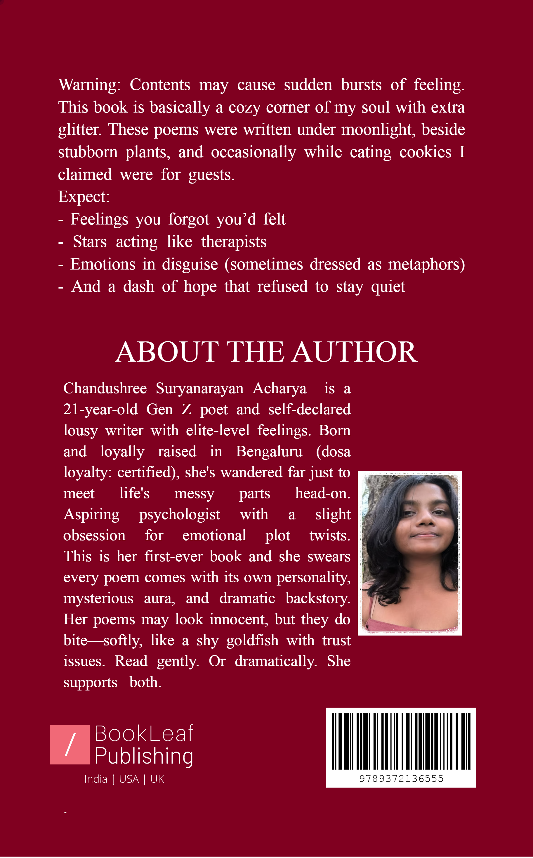 Chandushreee Suryanarayan Acharya debuts with Cockroach’s Perspective, a poetry collection that turns emotional debris into glittering metaphors. With humor sharp enough to shave existential dread and tenderness tucked inside the exoskeleton of everyday chaos, she invites readers to laugh through their feelings. Her poems dance with headless cockroaches, flirt with Venus flytraps, and occasionally sip melancholy from mismatched teacups. Chandushreee’s voice is clever, aching, and beautifully bizarre—an alchemy of wit and vulnerability that turns grief into giggles and truth into theatrical mischief. If poetry had a nervous system, hers would twitch in delight.