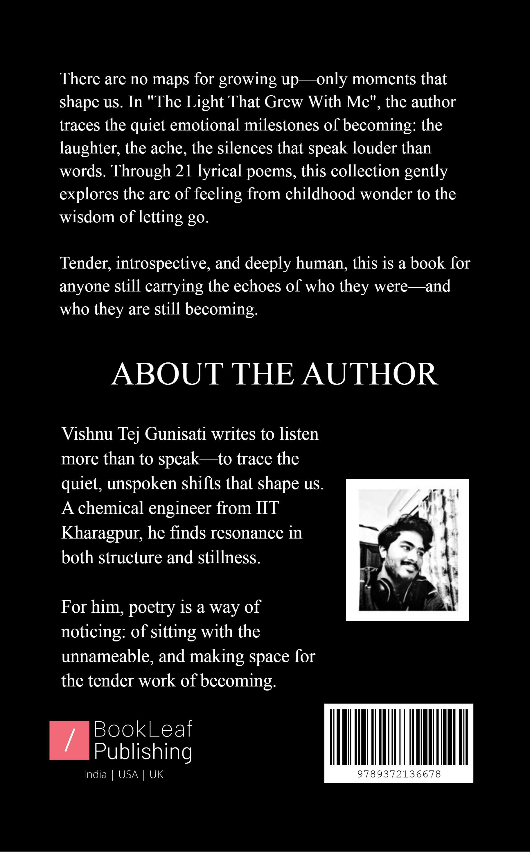 There are no maps for growing up—only moments that shape us. In "The Light That Grew With Me", the author traces the quiet emotional milestones of becoming: the laughter, the ache, the silences that speak louder than words. Through 21 lyrical poems, this collection gently explores the arc of feeling from childhood wonder to the wisdom of letting go.
