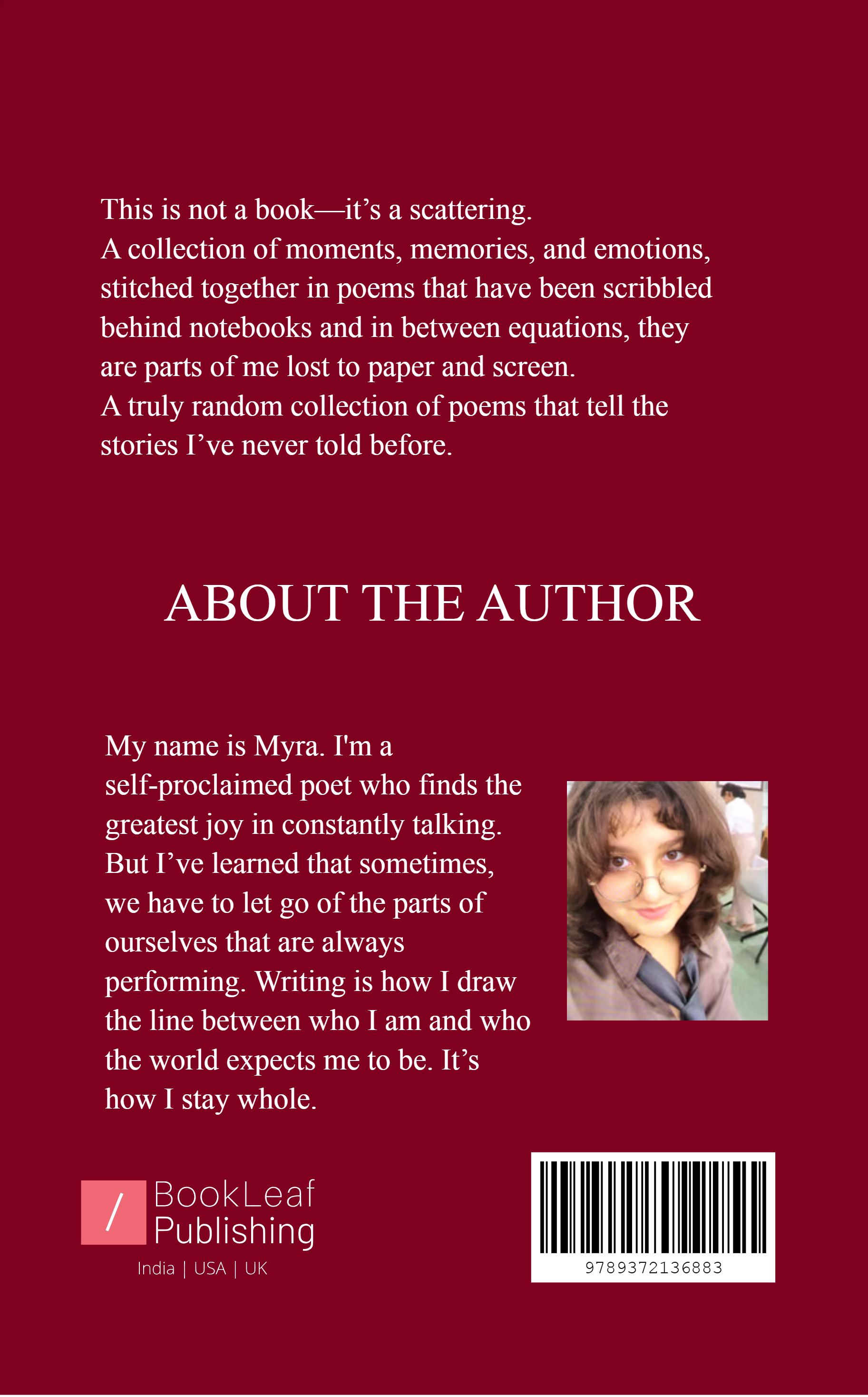 This is not a book—it’s a scattering. A collection of moments, memories, and emotions, stitched together in poems that have been scribbled behind notebooks and in between equations, they are parts of me lost to paper and screen.