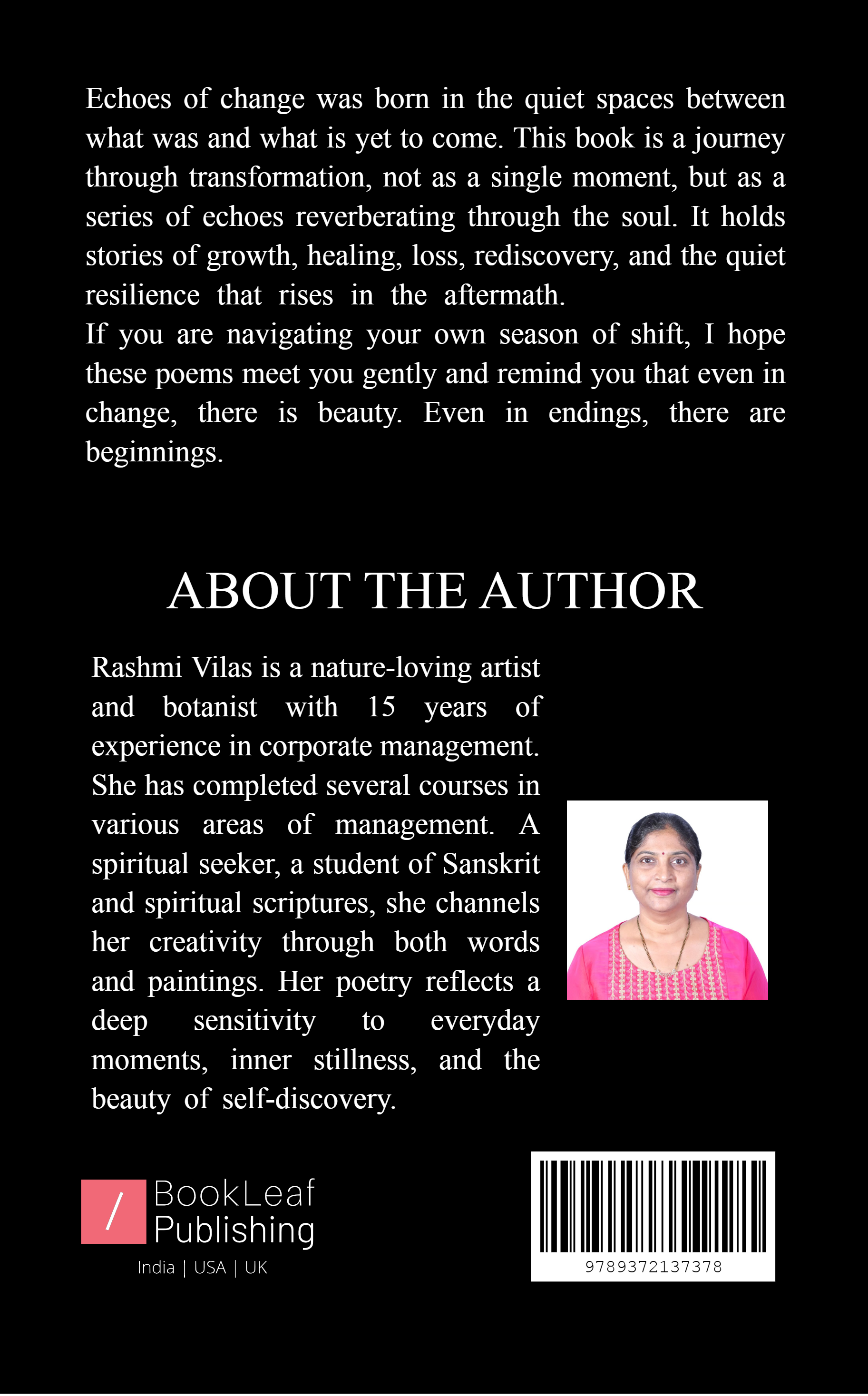 Echoes of change was born in the quiet spaces between what was and what is yet to come. This book is a journey through transformation, not as a single moment, but as a series of echoes reverberating through the soul. It holds stories of growth, healing, loss, rediscovery, and the quiet resilience that rises in the aftermath.