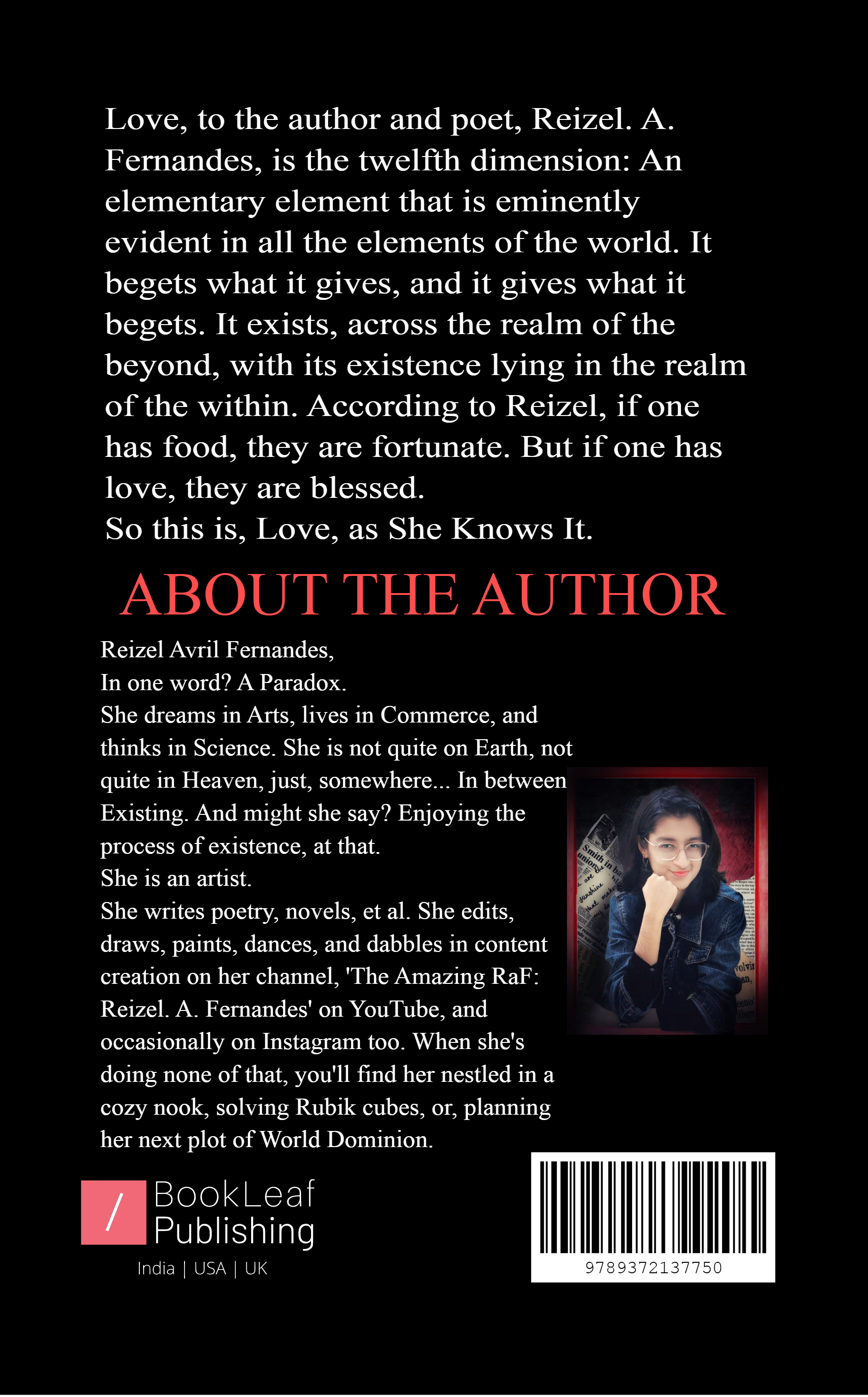 Love, to the author and poet, Reizel. A.Fernandes, is the twelfth dimension: An elementary element that is eminently evident in all the elements of the world. It begets what it gives, and it gives what it begets. It exists, across the realm of the beyond, with its existence lying in the realm of the within. According to Reizel, if one has food, they are fortunate. But if one has love, they are blessed.
