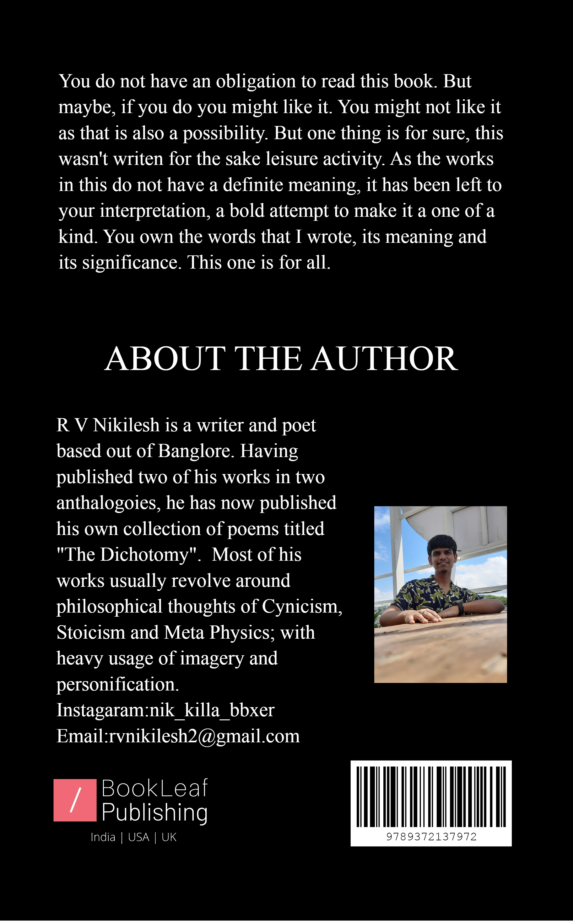 The Dichotomy is a collection of 21 poems written by R V Nikilesh. The poems usually revolve around many philosophical thoughts, taking inspiration from day to day experiences of all and written with rich imagery and emotional value. Meticulously done with reader's experience kept in mind.