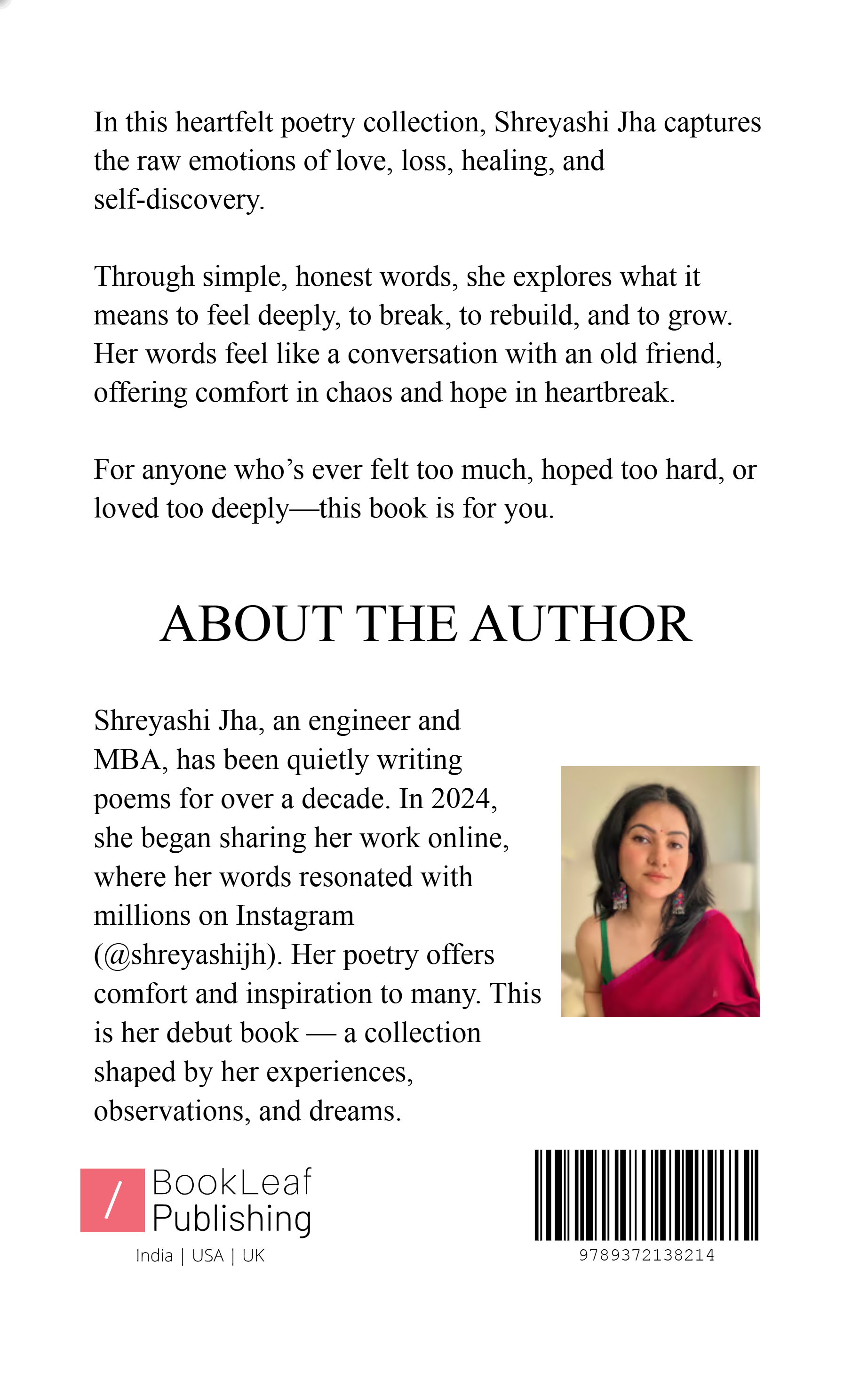 In this poetry collection, Shreyashi Jha takes you on a journey through self-discovery, love, loss, and resilience. With raw honesty and gentle strength, each poem reminds us that life's struggles are not setbacks—they are the stepping stones to becoming who we are meant to be.