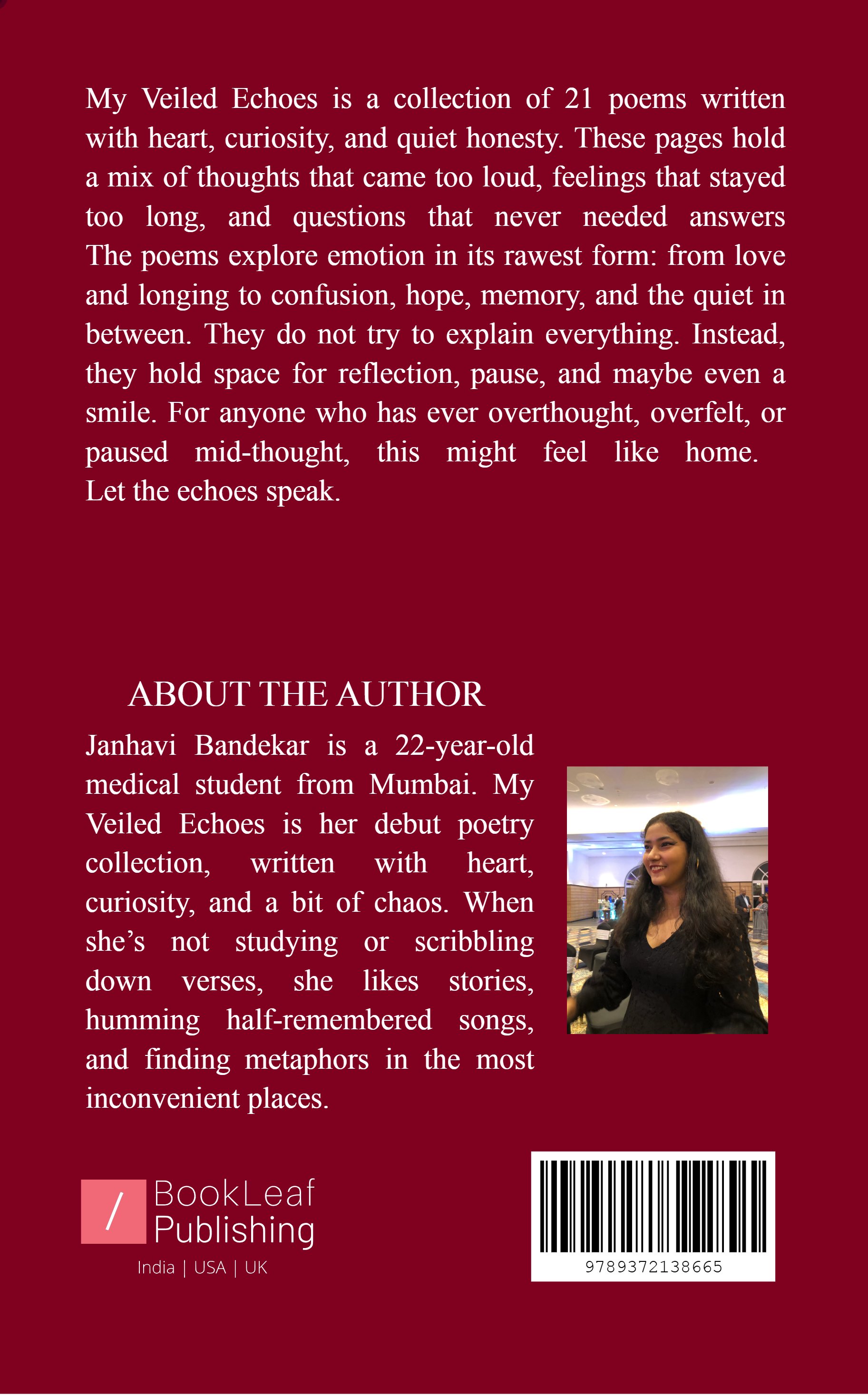 My Veiled Echoes is a collection of 21 poems that explore the quiet corners of human emotion—grief, hope, love, uncertainty, and all the in-betweens. For those who overthink, feel deeply, or pause mid-thought, this book might just feel like home.