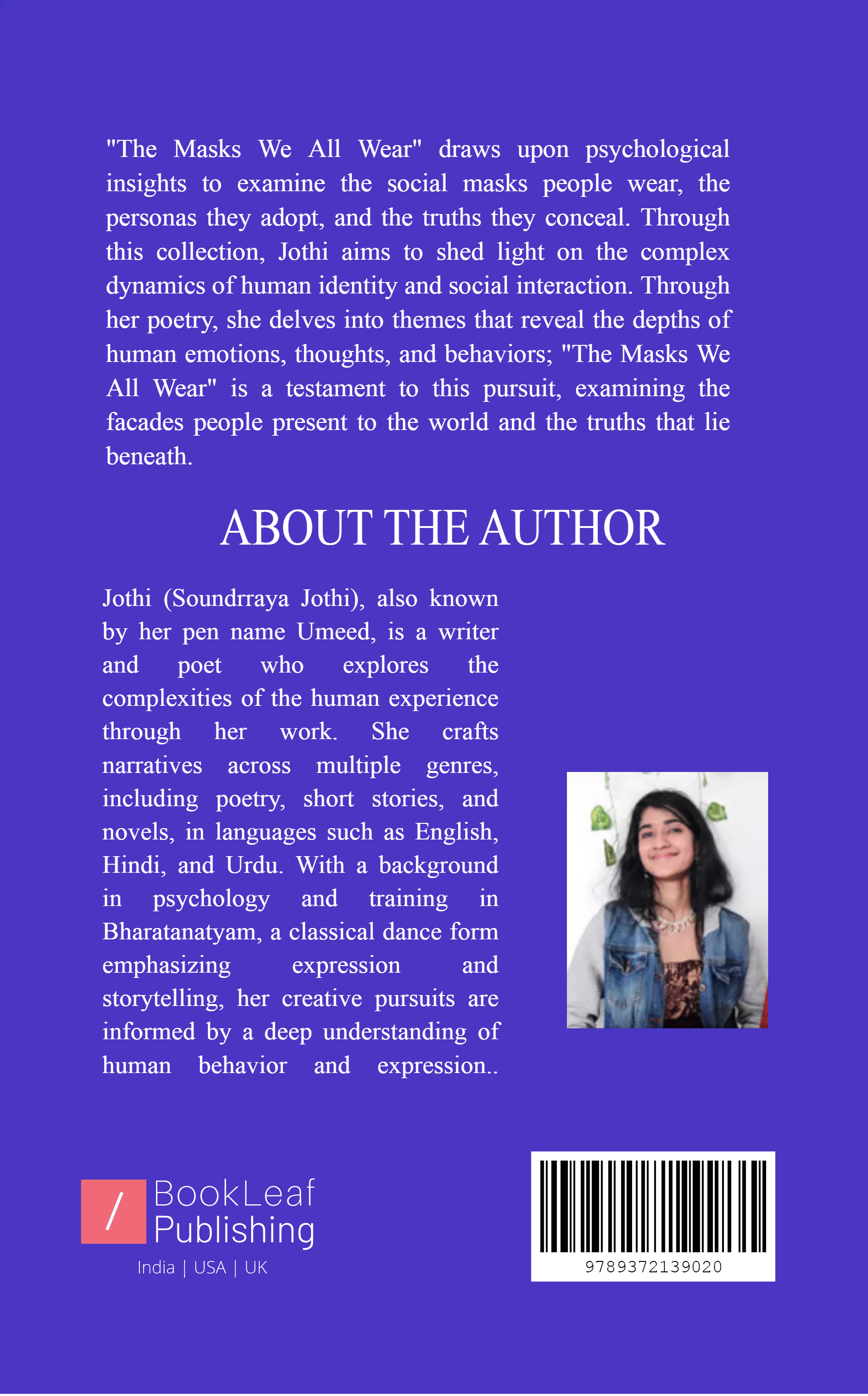 "The Masks We All Wear" draws upon psychological insights to examine the social masks people wear, the personas they adopt, and the truths they conceal. Through this collection, Jothi aims to shed light on the complex dynamics of human identity and social interaction. Through her poetry, she delves into themes that reveal the depths of human emotions, thoughts, and behaviors; "The Masks We All Wear" is a testament to this pursuit, examining the facades people present to the world and the truths that lie beneath.