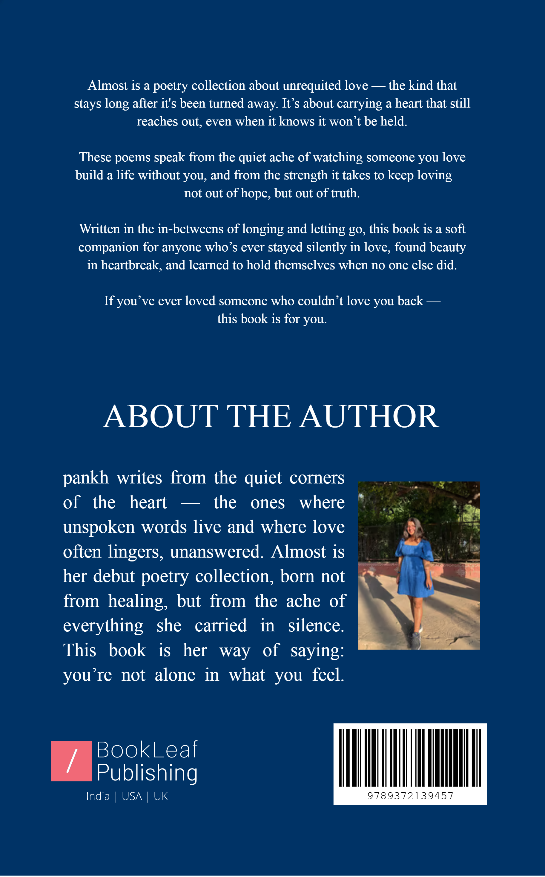 Almost is a poetry collection about unrequited love — the kind that stays long after it's been turned away. It’s about carrying a heart that still reaches out, even when it knows it won’t be held. Written in the in-betweens of longing and letting go, this book is a soft companion for anyone who’s ever stayed silently in love, found beauty in heartbreak, and learned to hold themselves when no one else did.