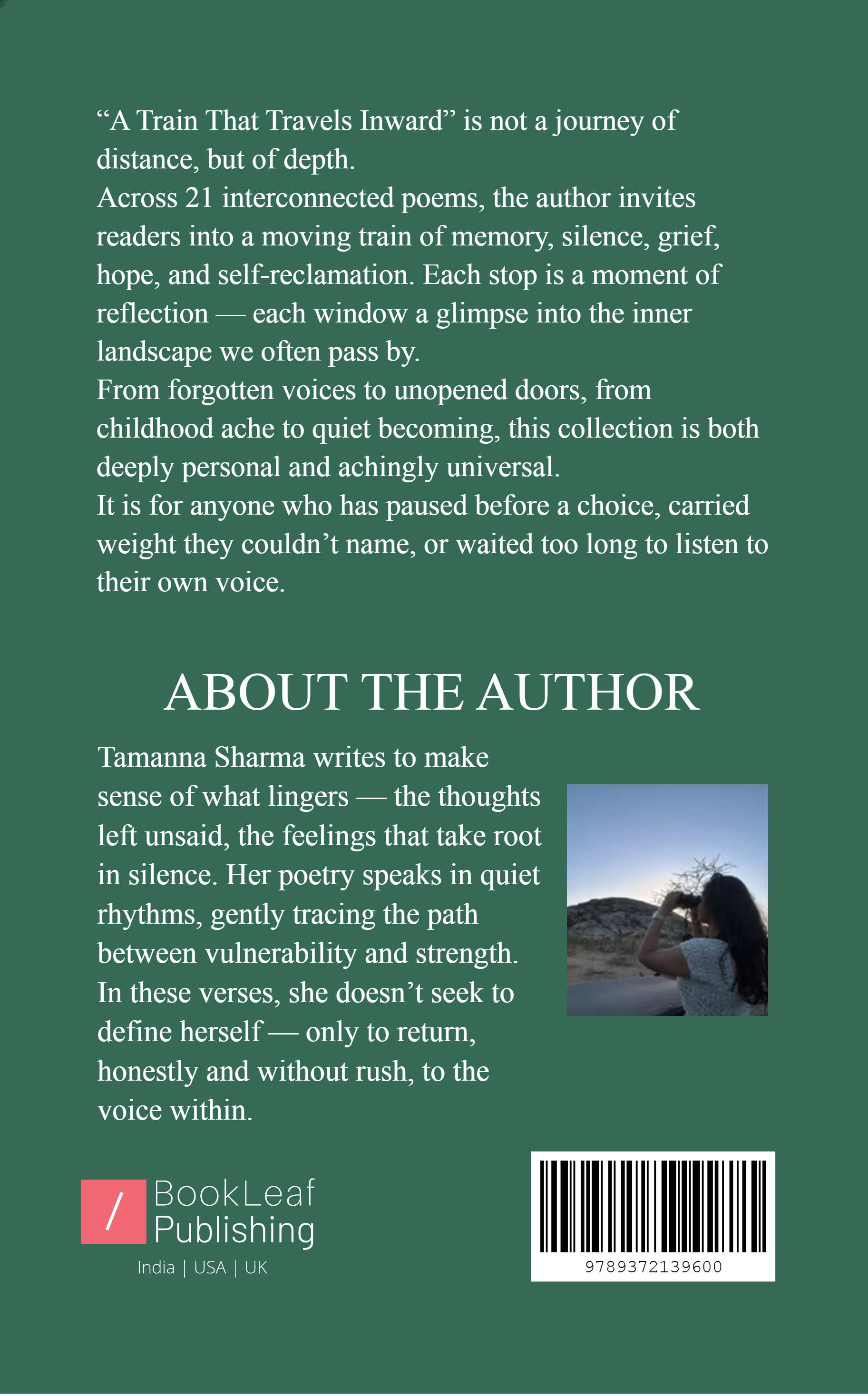“A Train That Travels Inward” is a poetic journey through 21 stops of memory, grief, reflection, and becoming. Each poem unfolds like a carriage — carrying unspoken thoughts, lost voices, and the quiet strength of self-realization. The Author crafts a world where not every destination is mapped, and not every weight has a name — yet the movement is honest, emotional, and necessary. This is not a tale of grand arrivals, but of gentle reckonings. For those who’ve paused before choices, longed for meaning in silence, or felt alone in motion — this book might feel like home.