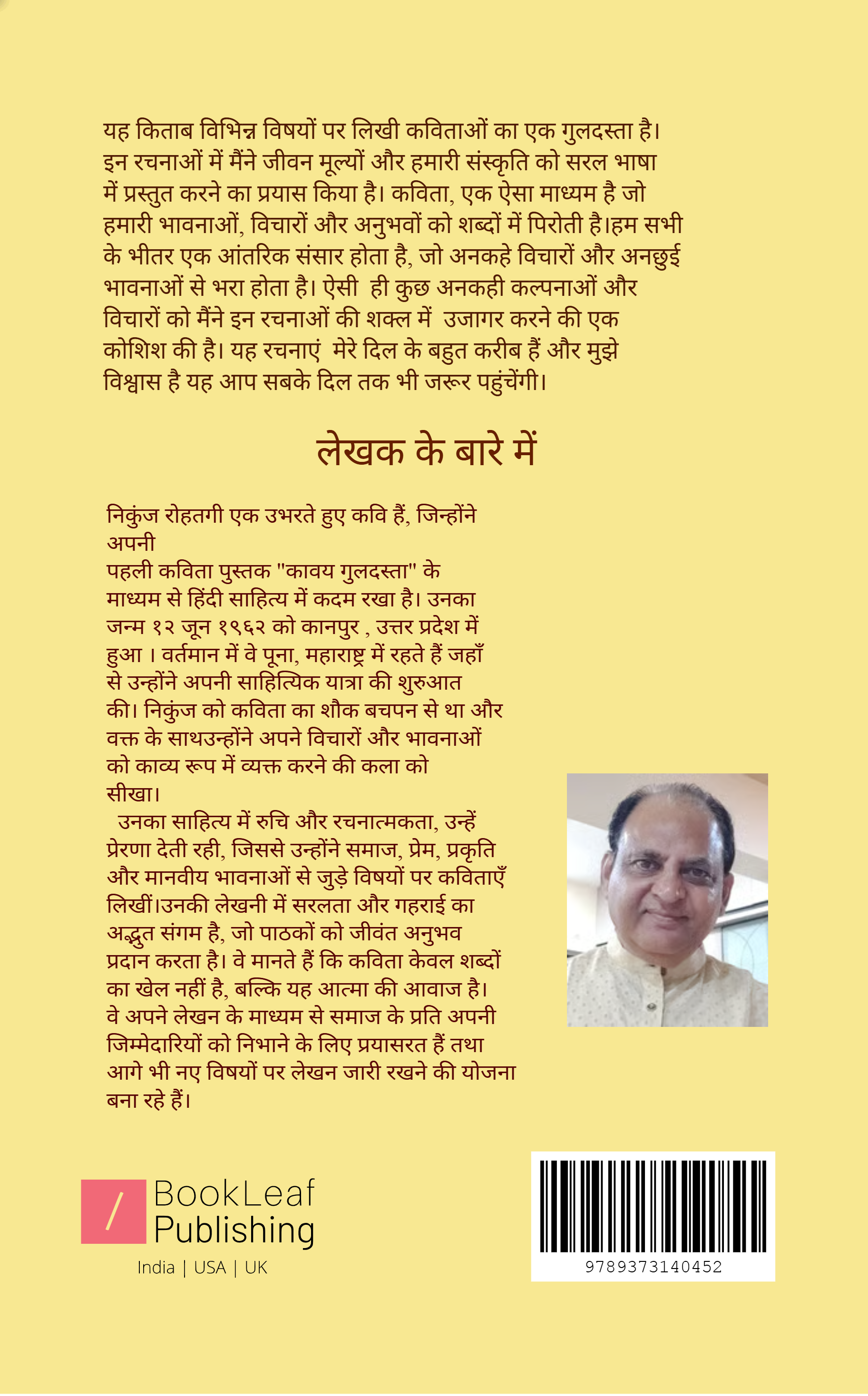 यह किताब विभिन्न विषयों पर लिखी कविताओं का एक गुलदस्ता है। इन रचनाओं में मैंने जीवन मूल्यों और हमारी संस्कृति को सरल भाषा में प्रस्तुत करने का प्रयास किया है। कविता, एक ऐसा माध्यम है जो हमारी भावनाओं, विचारों और अनुभवों को शब्दों में पिरोती है।हम सभी के भीतर एक आंतरिक संसार होता है, जो अनकहे विचारों और अनछुई भावनाओं से भरा होता है। ऐसी ही कुछ अनकही कल्पनाओं और विचारों को मैंने इन रचनाओं की शक्ल में उजागर करने की एक कोशिश की है। यह रचनाएं मेरे दिल के बहुत करीब हैं और मुझे विश्वास है यह आप सबके दिल तक भी जरूर पहुंचेंगी।
