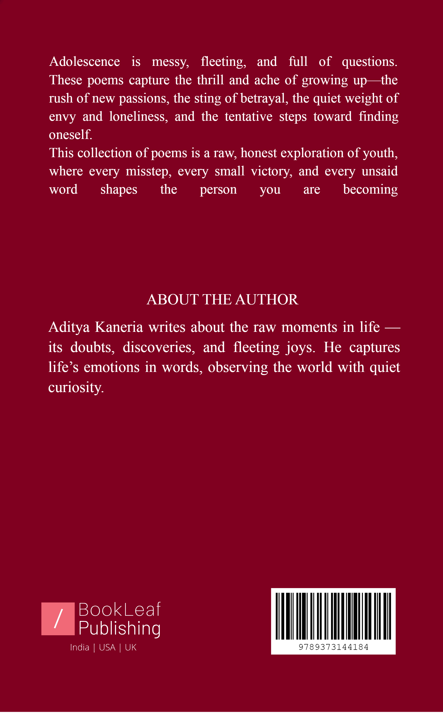 Thinking About Thoughts: Experiencing Adolescence is a raw and intimate collection of poems capturing the turbulence, wonder, and self-discovery of teenage years. From uncertainty and envy to heartbreak, joy, and newfound passions, these verses trace the emotional highs and lows of growing up. Each poem delves into the mind’s intricate landscapes, exploring doubt, desire, shame, and hope with honesty and sensitivity. With imagery that is both vivid and reflective, this anthology invites readers to confront their own adolescence, relive fleeting moments, and find meaning in the messy, beautiful process of becoming.
