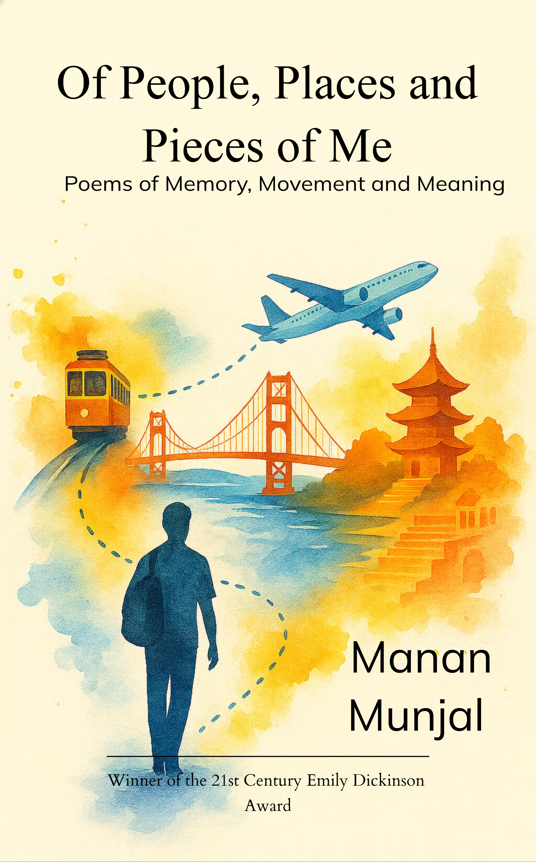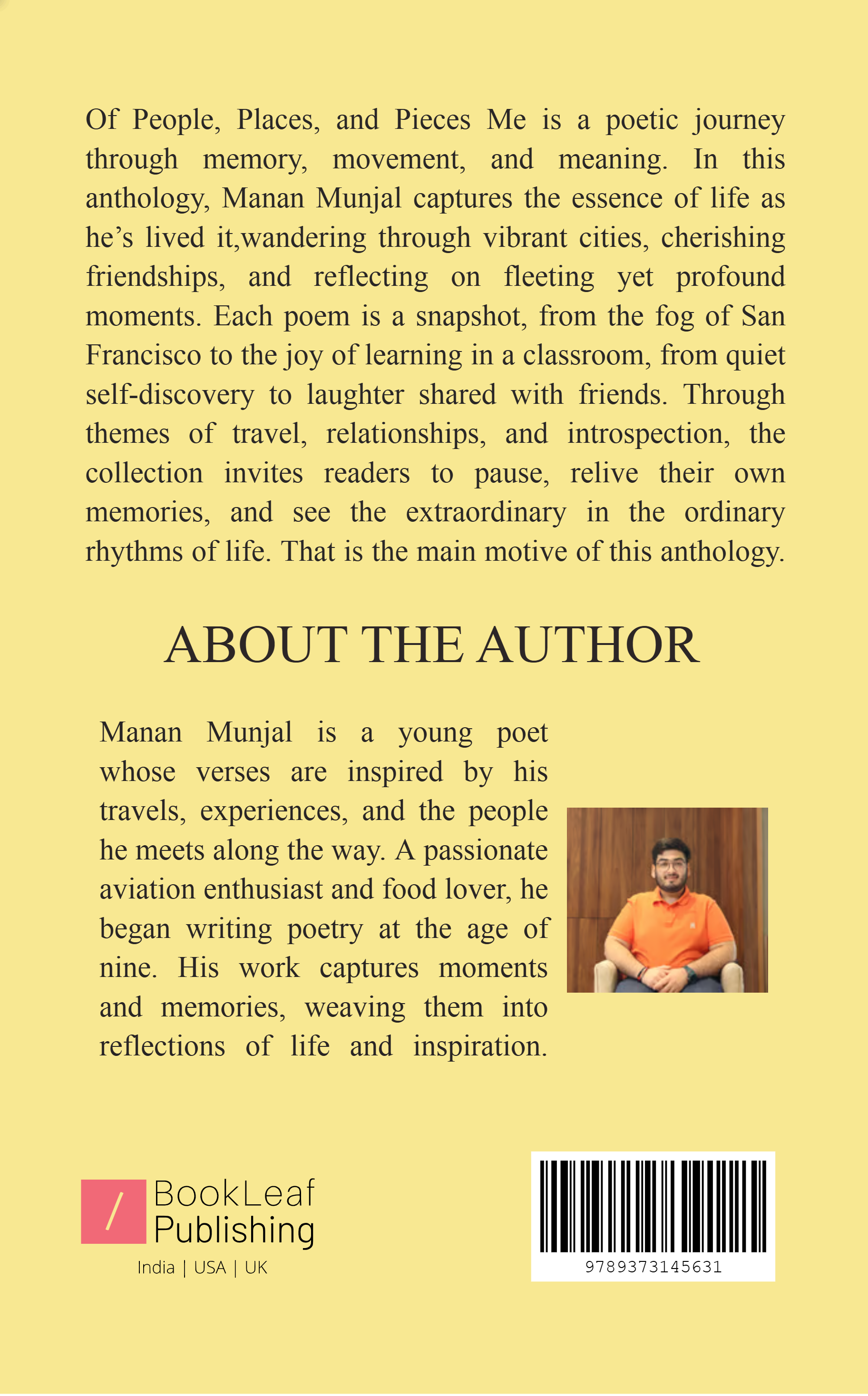 Of People, Places, and Pieces Me is a poetic journey through memory, movement, and meaning. In this anthology, Manan Munjal captures the essence of life as he’s lived it, wandering through vibrant cities, cherishing friendships, and reflecting on fleeting yet profound moments. Each poem is a snapshot, from the fog of San Francisco to the joy of learning in a classroom, from quiet self-discovery to laughter shared with friends. Through themes of travel, relationships, and introspection, the collection invites readers to pause, relive their own memories, and see the extraordinary in the ordinary rhythms of life.