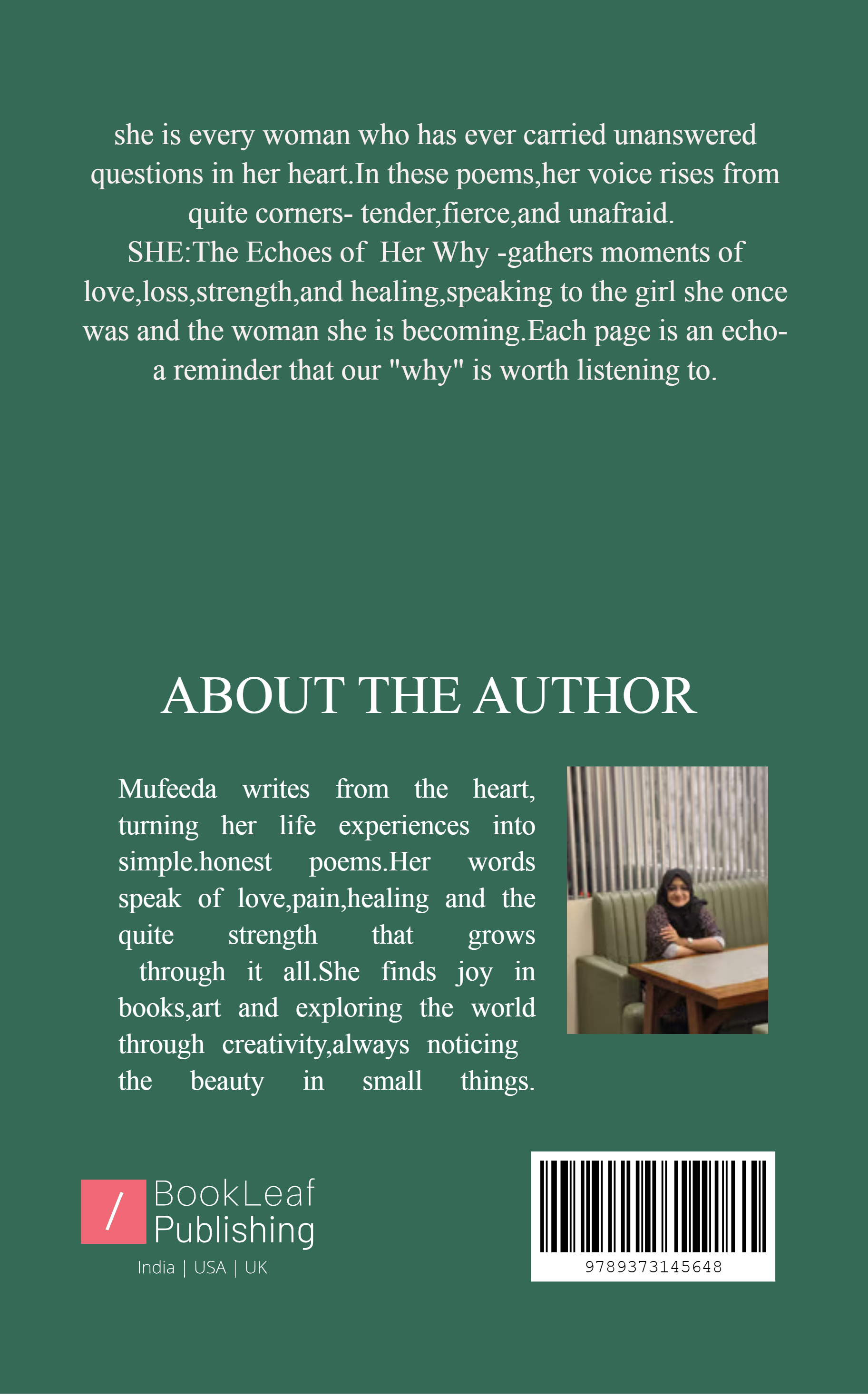 SHE – The Echoes of Her Why is a collection of poems that shares the untold stories of women. In clear and heartfelt words, Mufeeda writes about love, loss, healing, and the strength that grows through life’s struggles. Each poem reflects real emotions—sometimes gentle, sometimes strong—drawn from personal moments and everyday truths. This book is more than poetry; it is a friend for anyone who has felt, endured, and risen again.