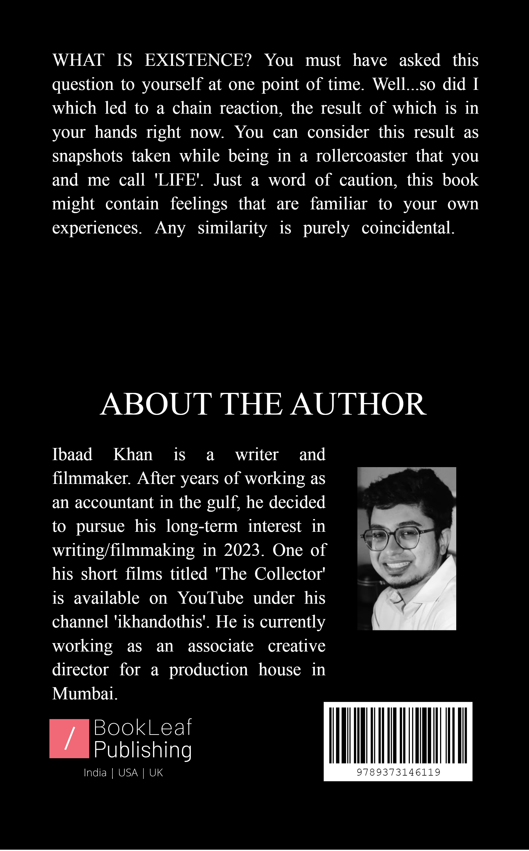 WHAT IS EXISTENCE? You must have asked this question to yourself at one point of time. Well...so did I which led to a chain reaction, the result of which is in your hands right now. You can consider this result as snapshots taken while being in a rollercoaster that you and me call 'LIFE'. Just a word of caution, this book might contain feelings that are familiar to your own experiences. Any similarity is purely coincidental.