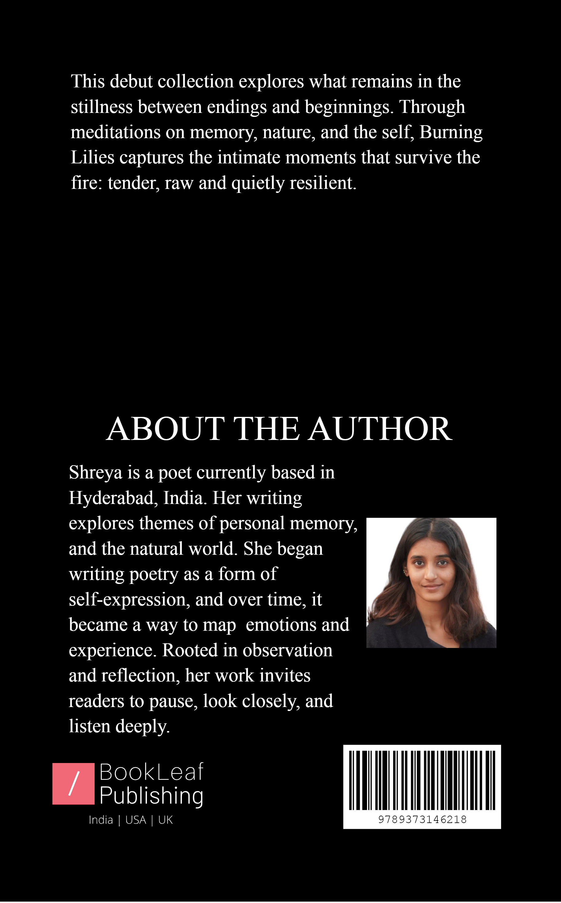 Burning Lilies: After the Fire, Before the Ash is a debut poetry collection that explores the quiet aftermath of transformation. Through themes of memory, nature, and existential reflection, these poems reflect on what is left behind and what continues to grow. Shreya’s voice is tender and unflinching, offering readers a space to pause, feel, and remember.