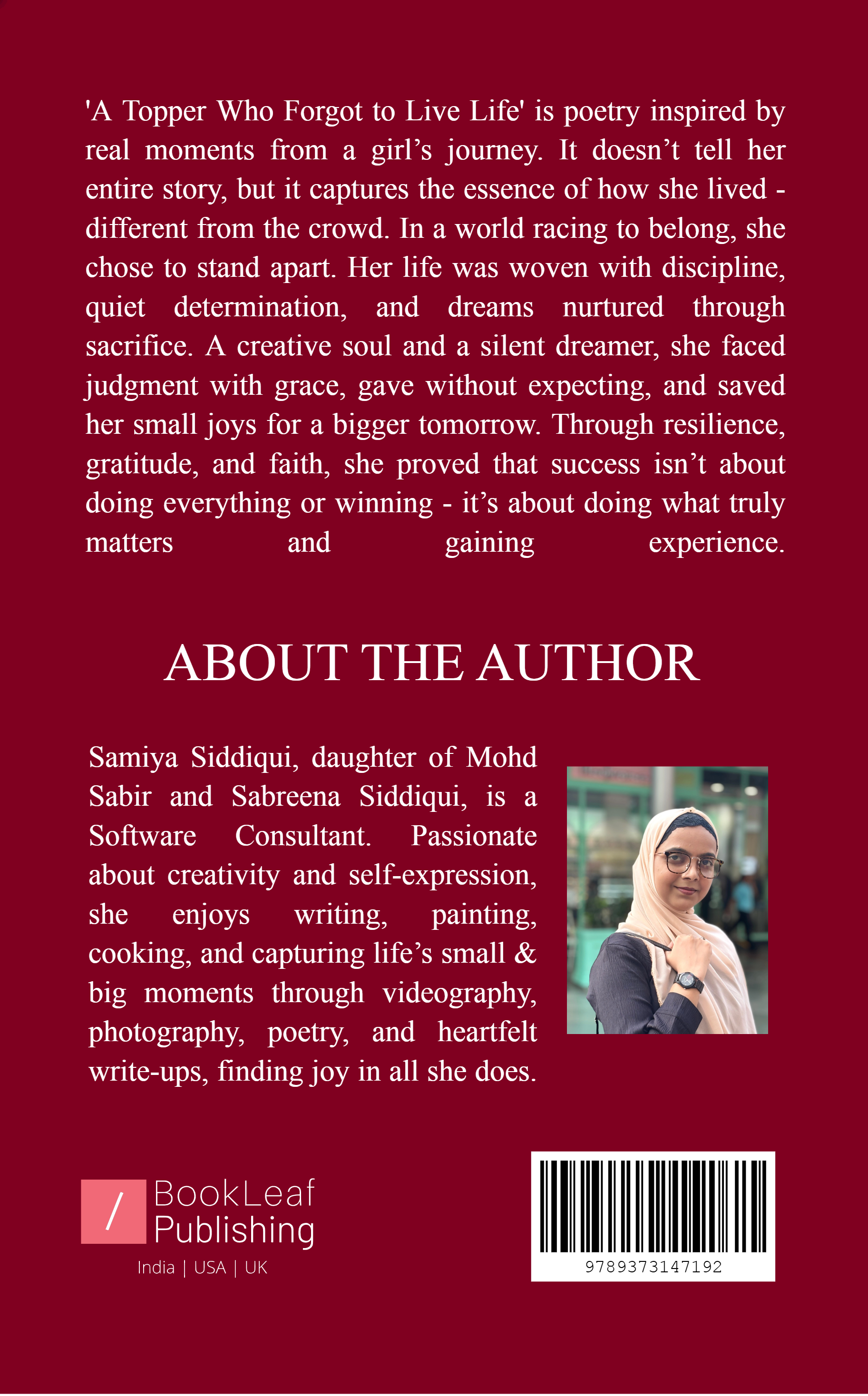 A Topper Who Forgot to Live Life is poetry inspired by real moments from a girl’s journey. It doesn’t tell her entire story, but it captures the essence of how she lived, different from the crowd. In a world racing to belong, she chose to stand apart. Her life was woven with discipline, quiet determination, and dreams nurtured through sacrifice. A creative soul and a silent dreamer, she faced judgment with grace, gave without expecting, and saved her small joys for a bigger tomorrow. Through resilience, gratitude, and faith, she proved that success isn’t about doing everything or winning - it’s about doing what truly matters and gaining experience.