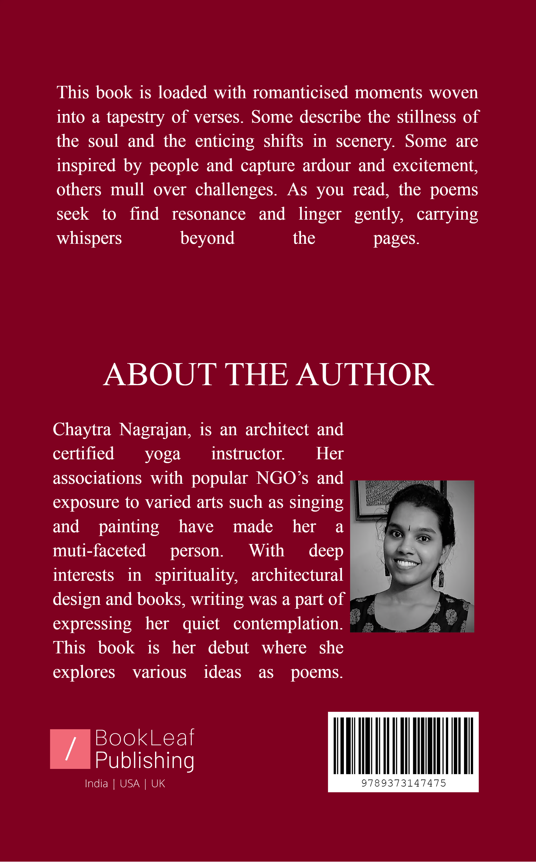 This book is loaded with romanticised moments woven into a tapestry of verses. Some describe the stillness of the soul and the enticing shifts in scenery. Some are inspired by people and capture ardour and excitement, others mull over challenges. As you read, the poems seek to find resonance and linger gently, carrying whispers beyond the page.