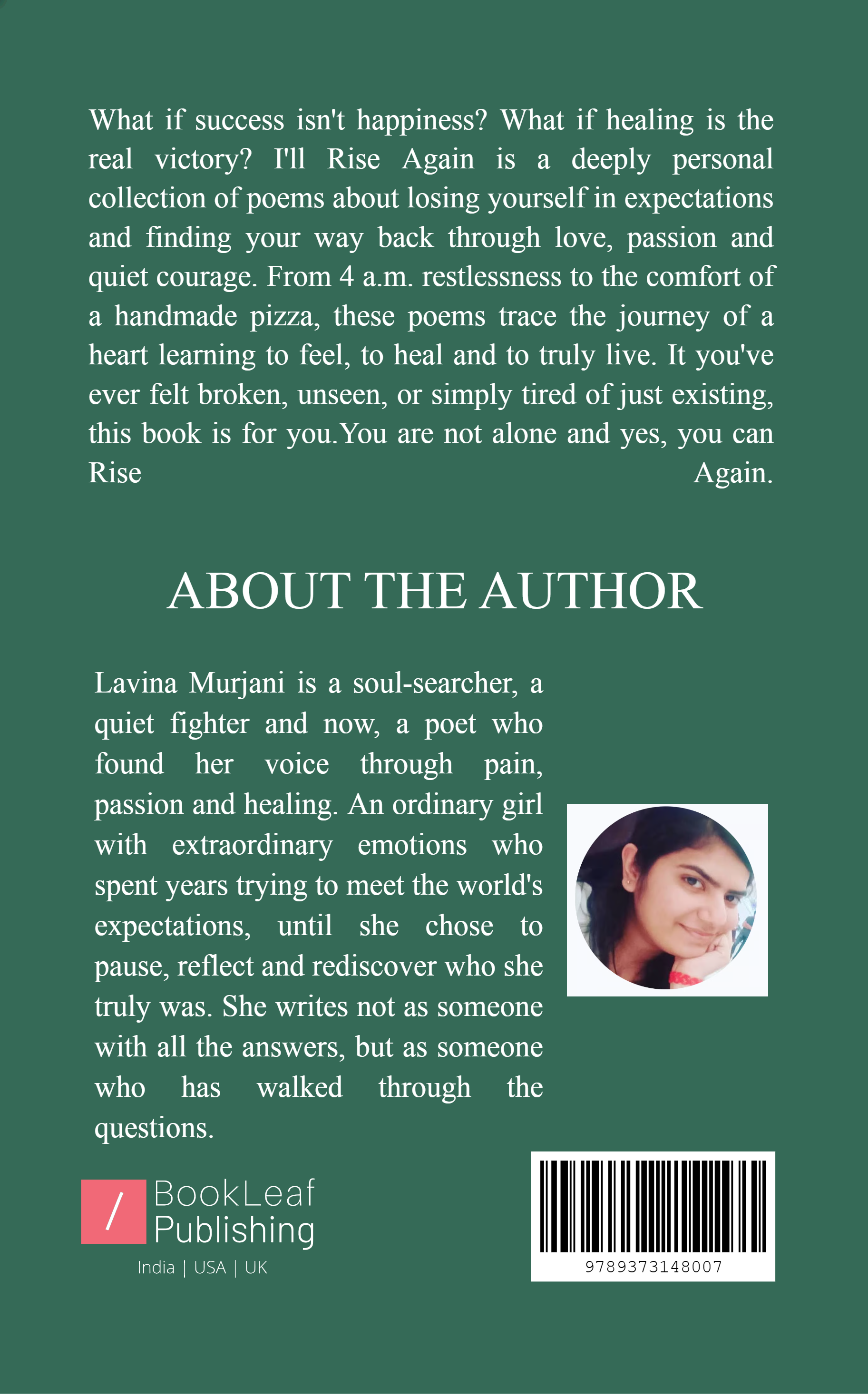 What if success isn't happiness? What if healing is the real victory? I Will Rise Again is a deeply personal collection of poems about losing yourself in expectations and finding your way back through love, passion, and quiet courage. From 4 a.m. restlessness to the comfort of a handmade pizza, these poems trace the journey of a heart learning to feel, to heal, and to truly live. If you've ever felt broken, unseen, or simply tired of just existing, this book is for you. You're not alone and yes, you can rise again.