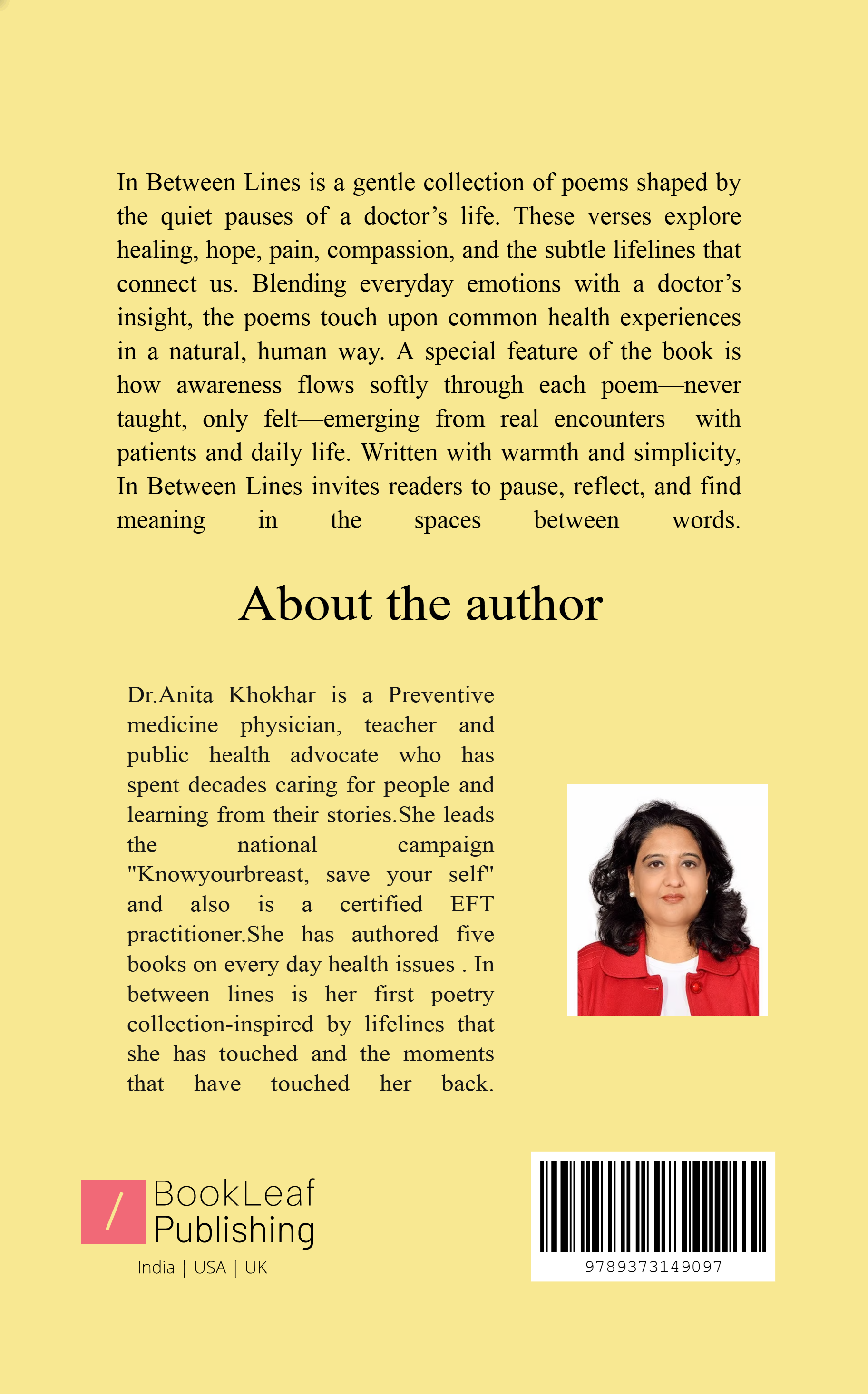In Between Lines is a gentle collection of poems shaped by the quiet pauses of a doctor’s life. These verses explore healing, hope, pain, compassion, and the subtle lifelines that connect us. Blending everyday emotions with a doctor’s insight, the poems touch upon common health experiences in a natural, human way. A special feature of the book is how awareness flows softly through each poem—never taught, only felt—emerging from real encounters with patients and daily life. Written with warmth and simplicity, In Between Lines invites readers to pause, reflect, and find meaning in the spaces between words.