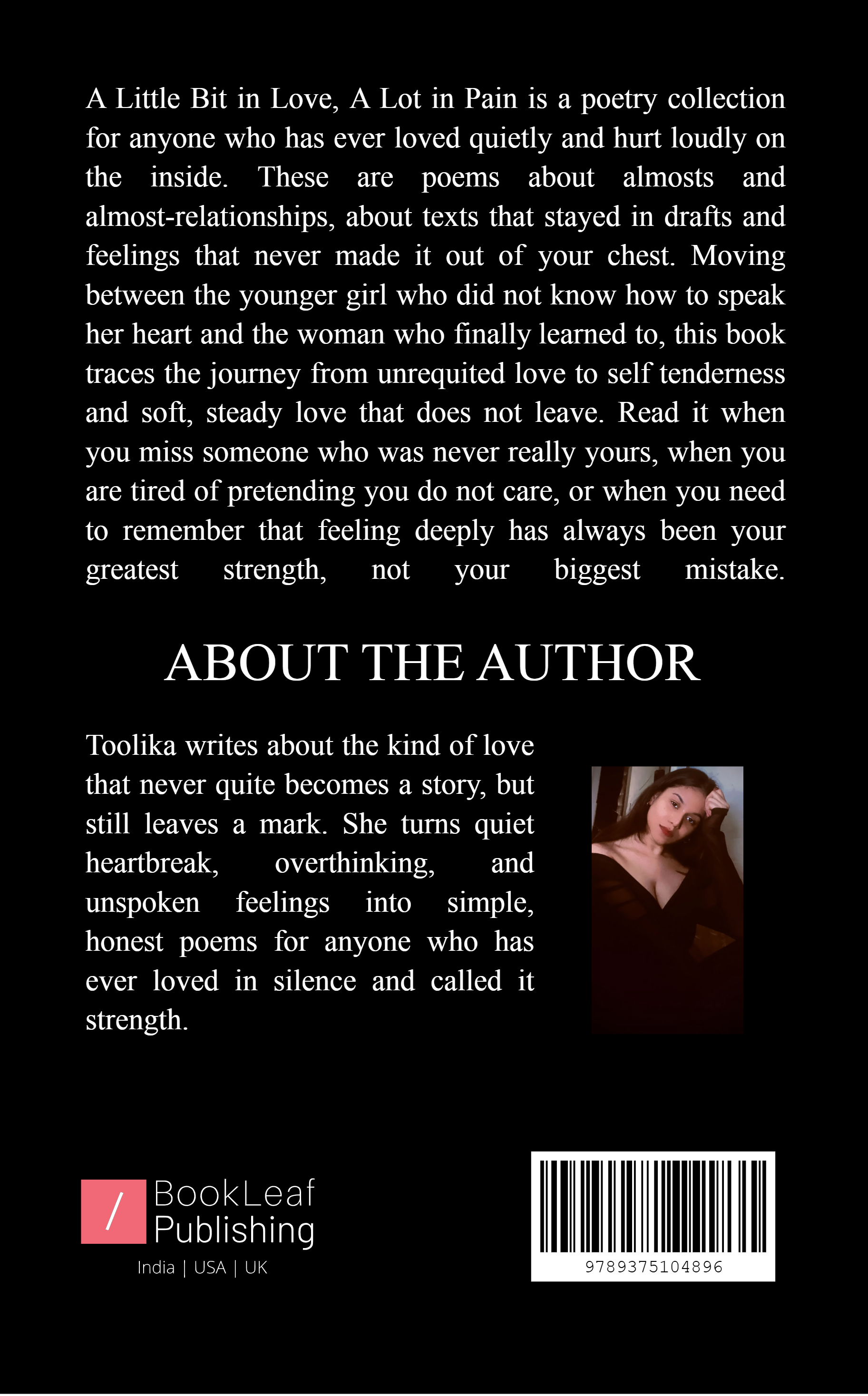 A Little Bit in Love, A Lot in Pain is a collection of intimate poems about unrequited love, quiet heartbreak, and the girl who felt everything but rarely said it out loud. Moving through crushes, almosts, and one-sided goodbyes, these pieces trace the journey from longing to gentle self-respect and, finally, to a love that feels safe. This book is for anyone who has ever loved too softly and hurt too deeply in silence.